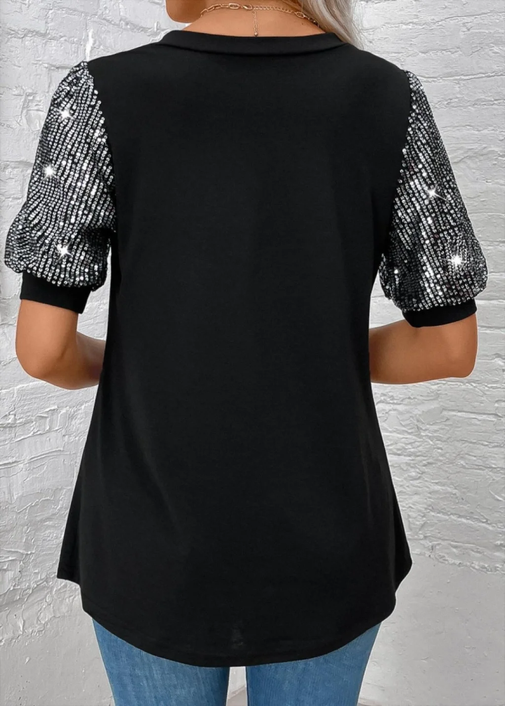 Kadın Kısa Kollu V Yakalı Pul Payet Detaylı Viskon Bluz