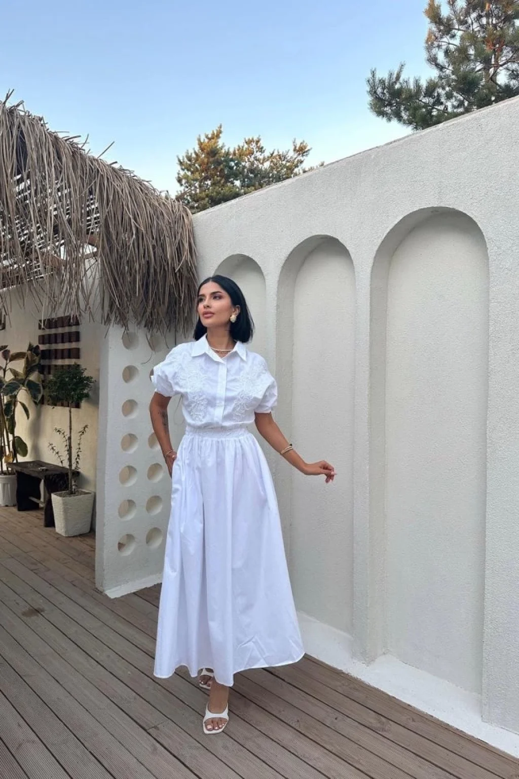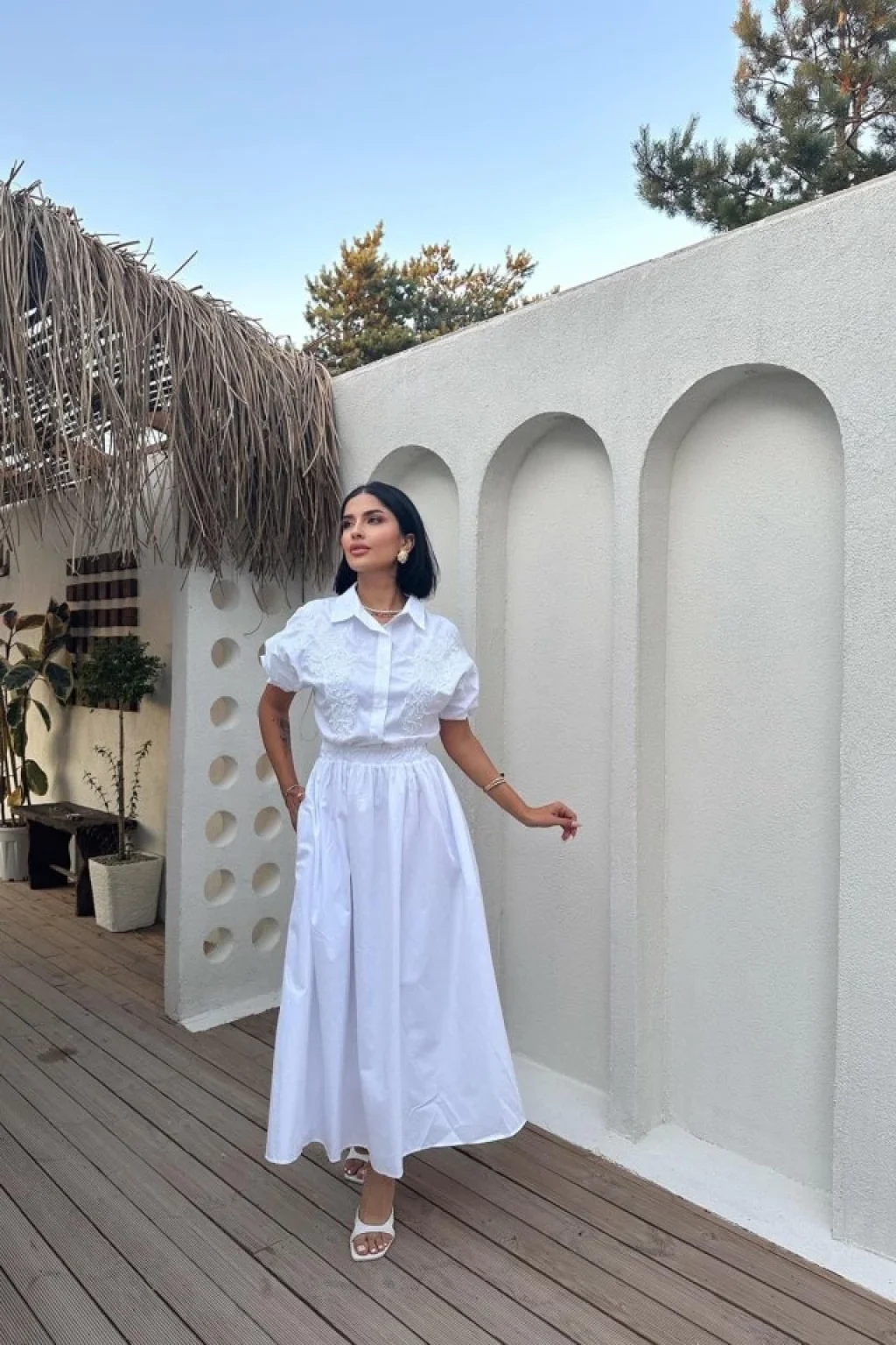 Beyaz Nakışlı İşlemeli Elbise