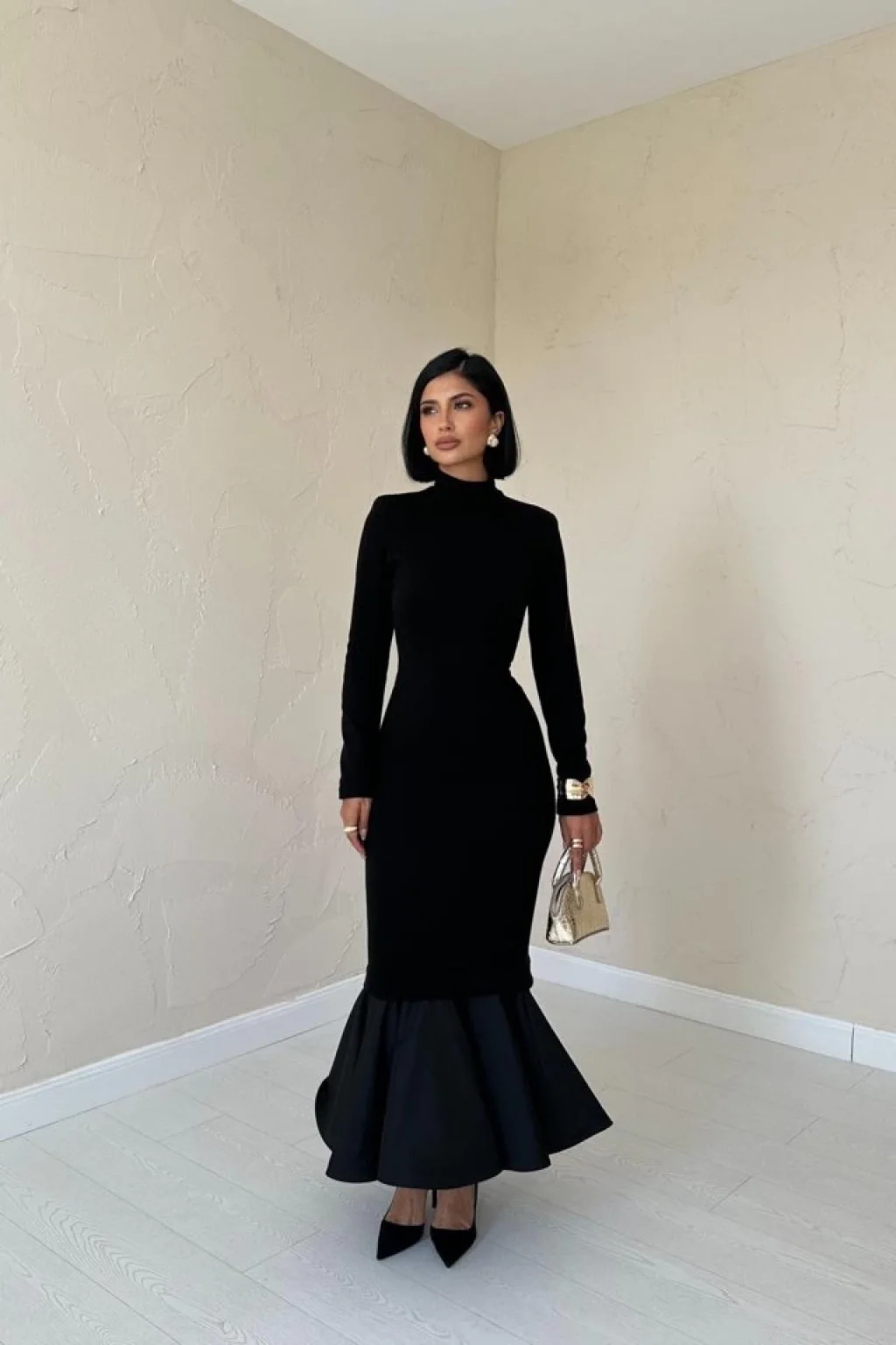 Kadın Uzun Kollu Yarı Balıkçı Yaka Kollar Düğme Detaylı Kısa şardonlu Kaşkorse Elbise