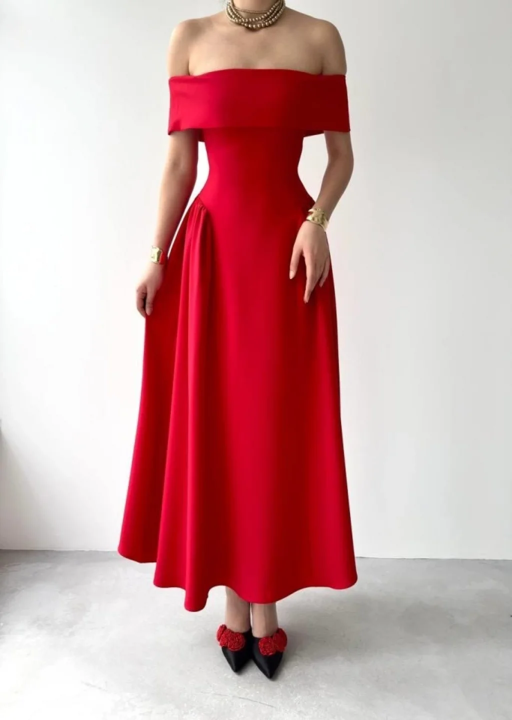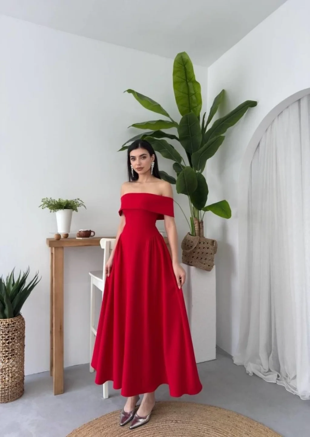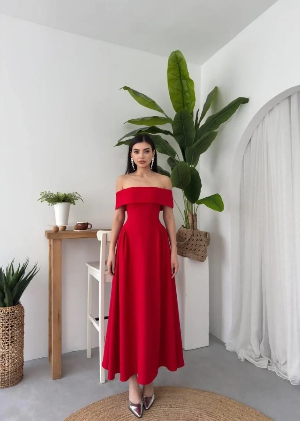 Kadın Uzun Kollu Geometrik Yaka Midi Ithal Krep Elbise