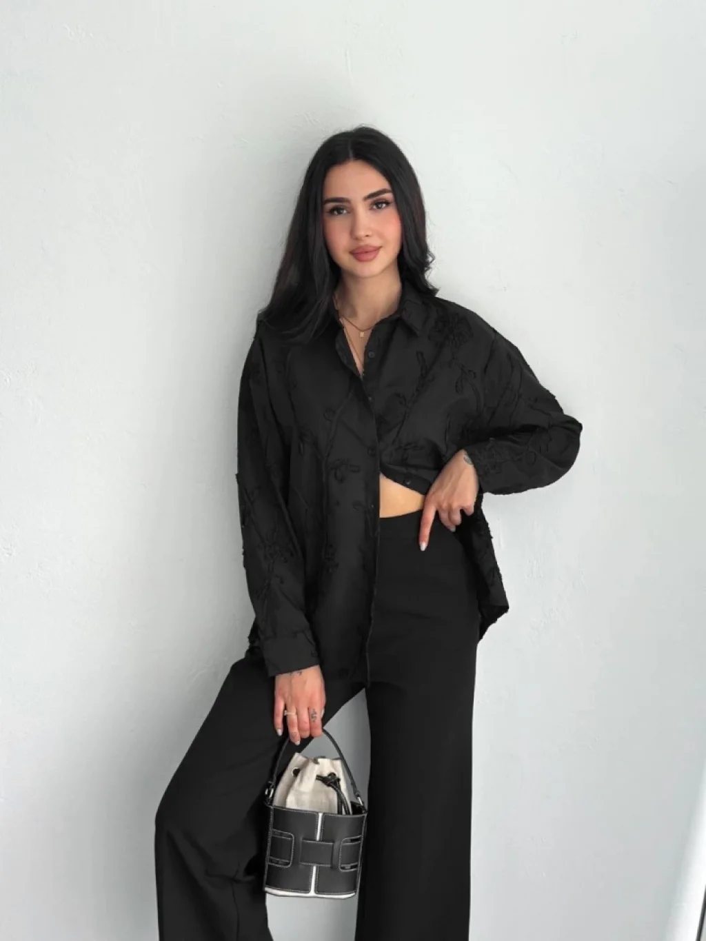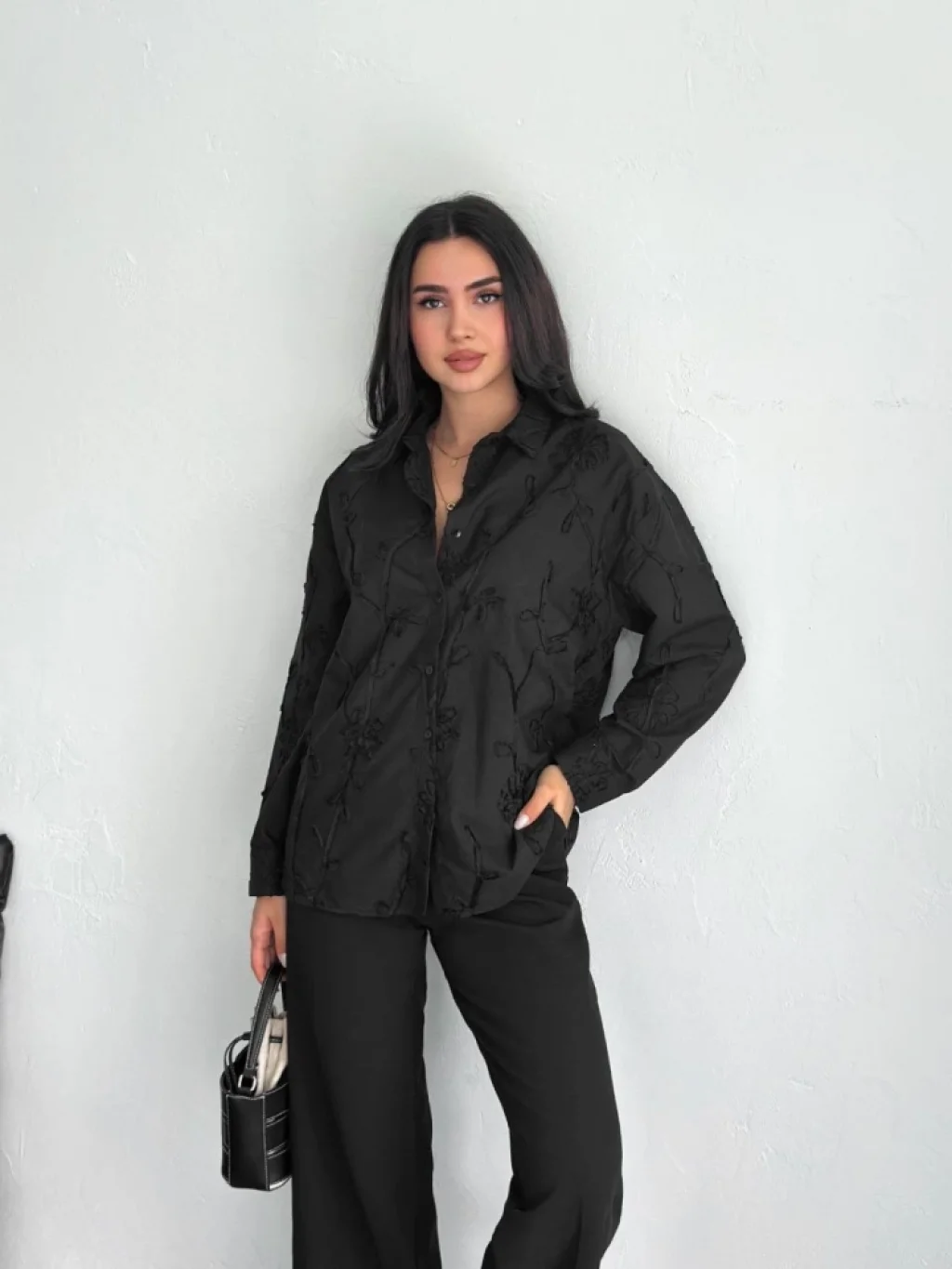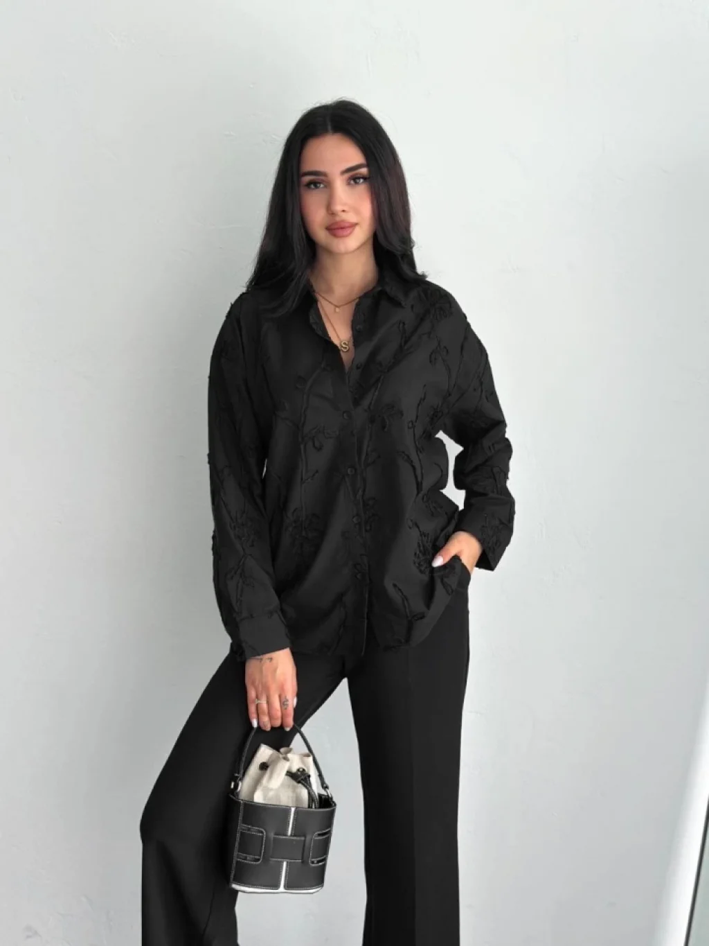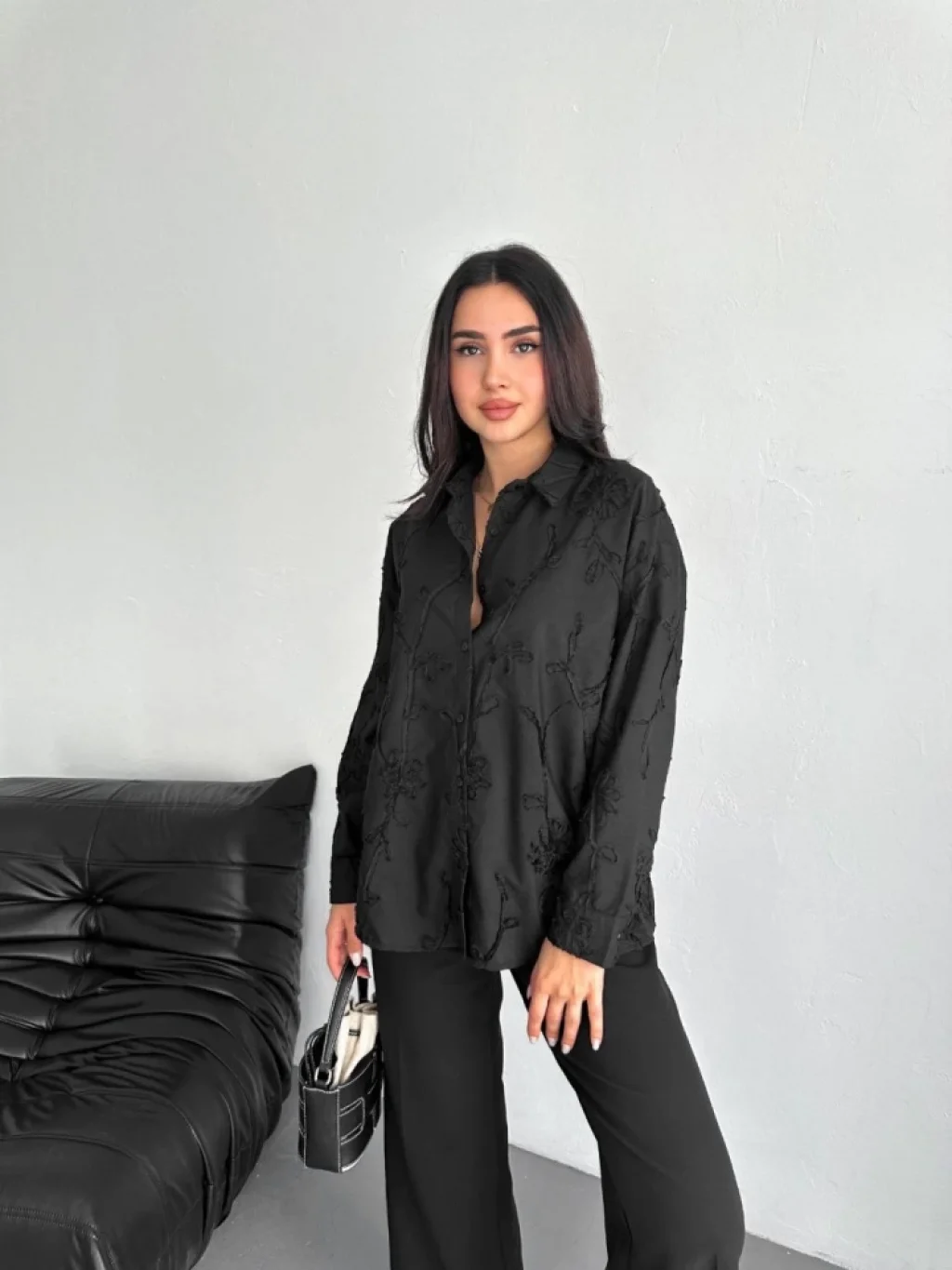 Nakışlı Uzun Kollu Gömlek - Siyah