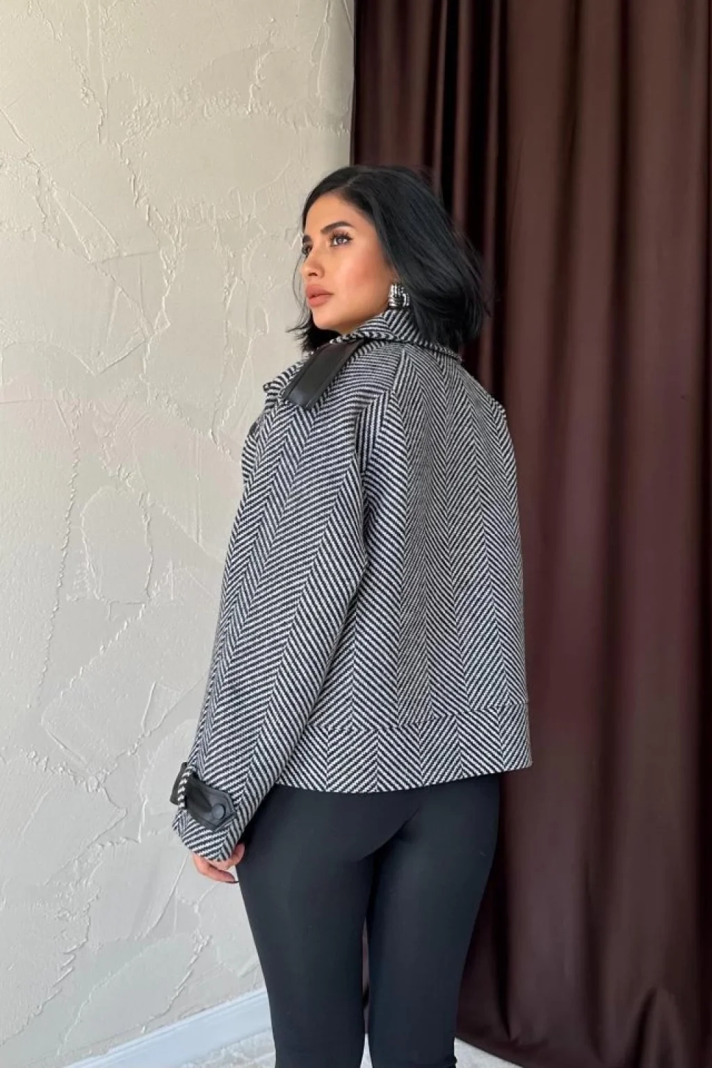 <p>Gri Çizgili Deri Garnili Ceket</p><br> <p>Modelin Ölçüleri: Boy:165, Kg:55, Göğüs:90, Bel:72, Kalça: 100</p><br> <p>Modelin üzerindeki ürün M/38 bedendir</p><br> <ul> </ul>