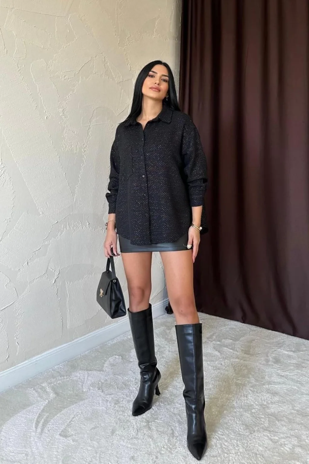 <p>Siyah Işıltılı Gömlek</p><br> <p>Modelin Ölçüleri: Boy:165, Kg:55, Göğüs:90, Bel:72, Kalça: 100</p><br> <p>Modelin üzerindeki ürün M/38 bedendir</p><br> <ul> </ul>