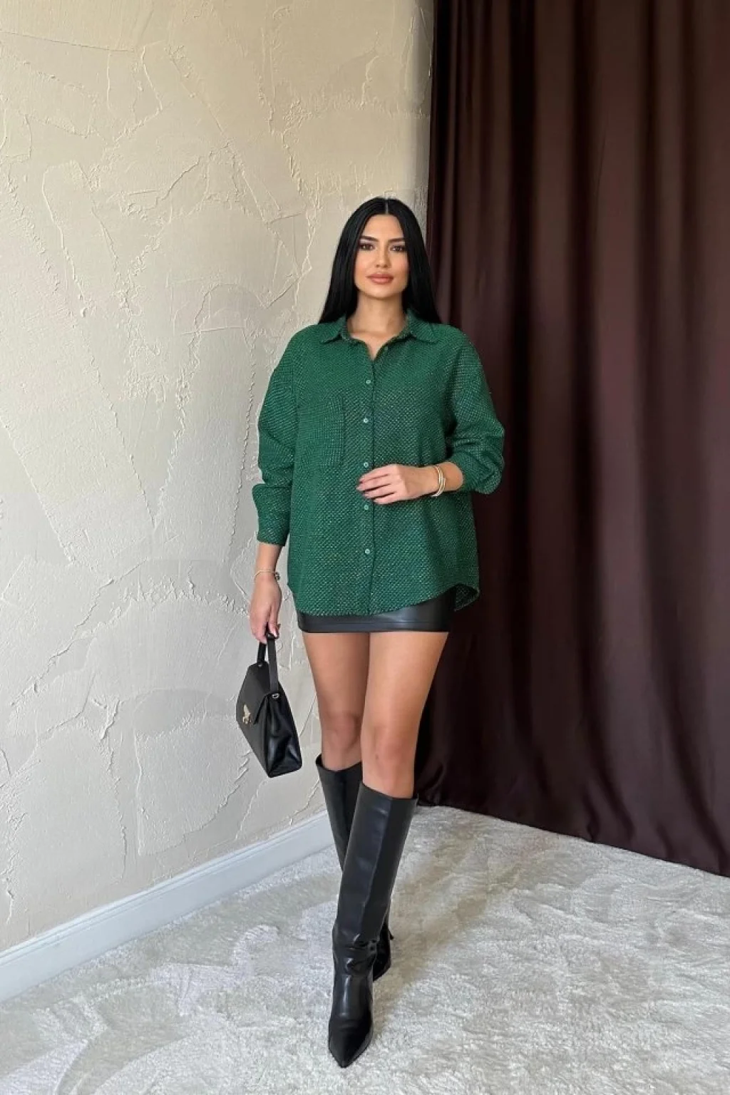 <p>Yeşil Işıltılı Gömlek</p><br> <p>Modelin Ölçüleri: Boy:165, Kg:55, Göğüs:90, Bel:72, Kalça: 100</p><br> <p>Modelin üzerindeki ürün M/38 bedendir</p><br> <ul> </ul>