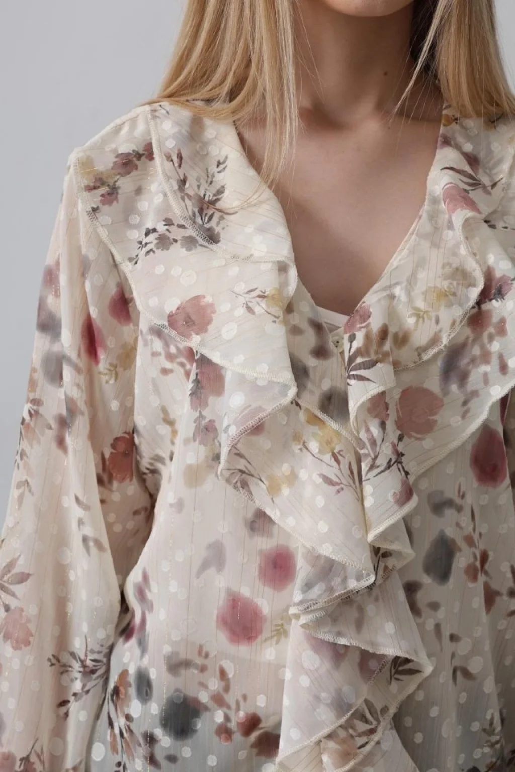 Volanlı Çiçek Desen Şifon Gömlek - Krem