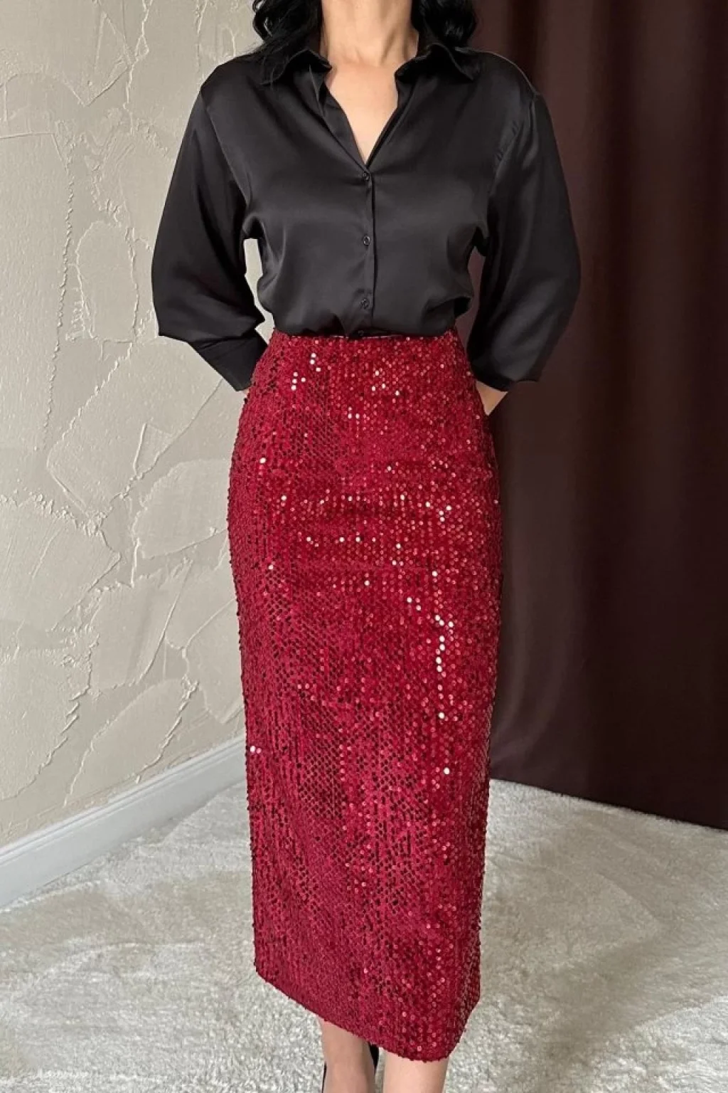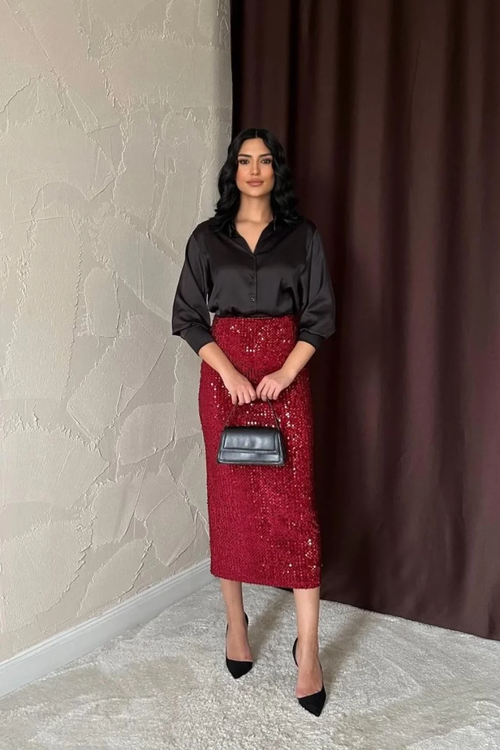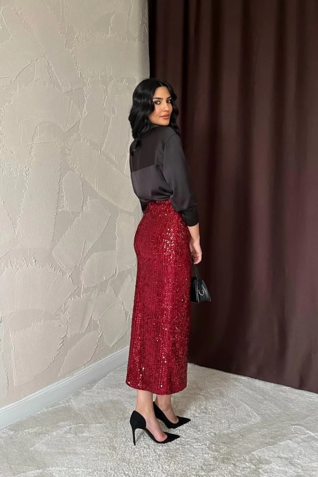<p>Bordo Pulpayetli Parlak Etek</p><br> <p>Modelin Ölçüleri: Boy:165, Kg:55, Göğüs:90, Bel:72, Kalça: 100</p><br> <p>Modelin üzerindeki ürün M/38 bedendir</p><br> <ul> </ul>