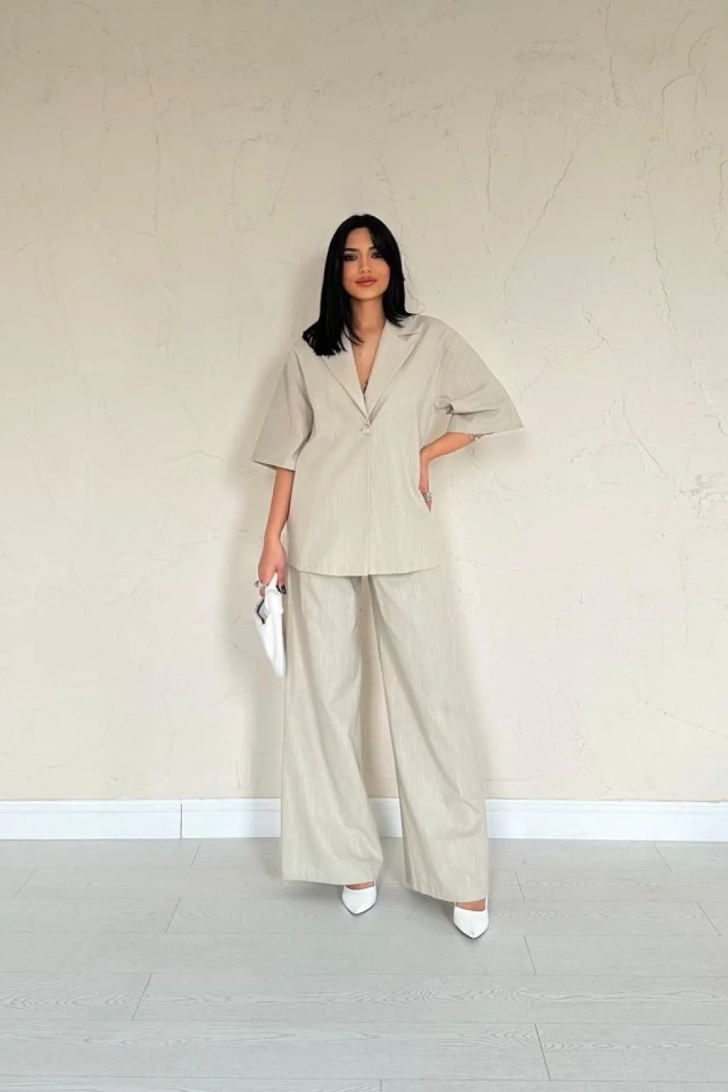 <p>Bej Önü Tek Düğmeli Ceket Pantolon Takım</p><br> <p>Modelin Ölçüleri: Boy:165, Kg:55, Göğüs:90, Bel:72, Kalça: 100</p><br> <p>Modelin üzerindeki ürün M/38 bedendir</p><br> <ul> </ul>