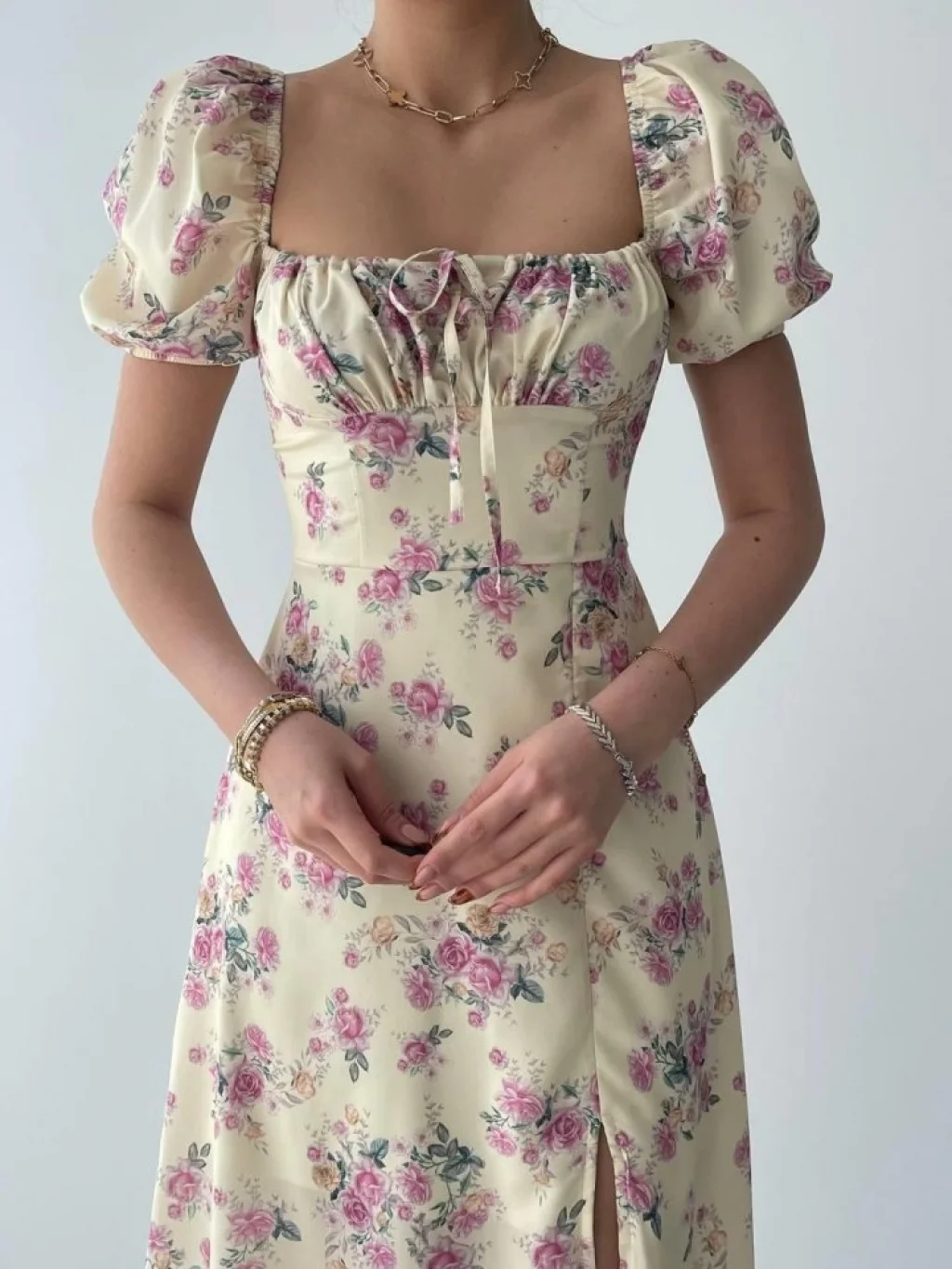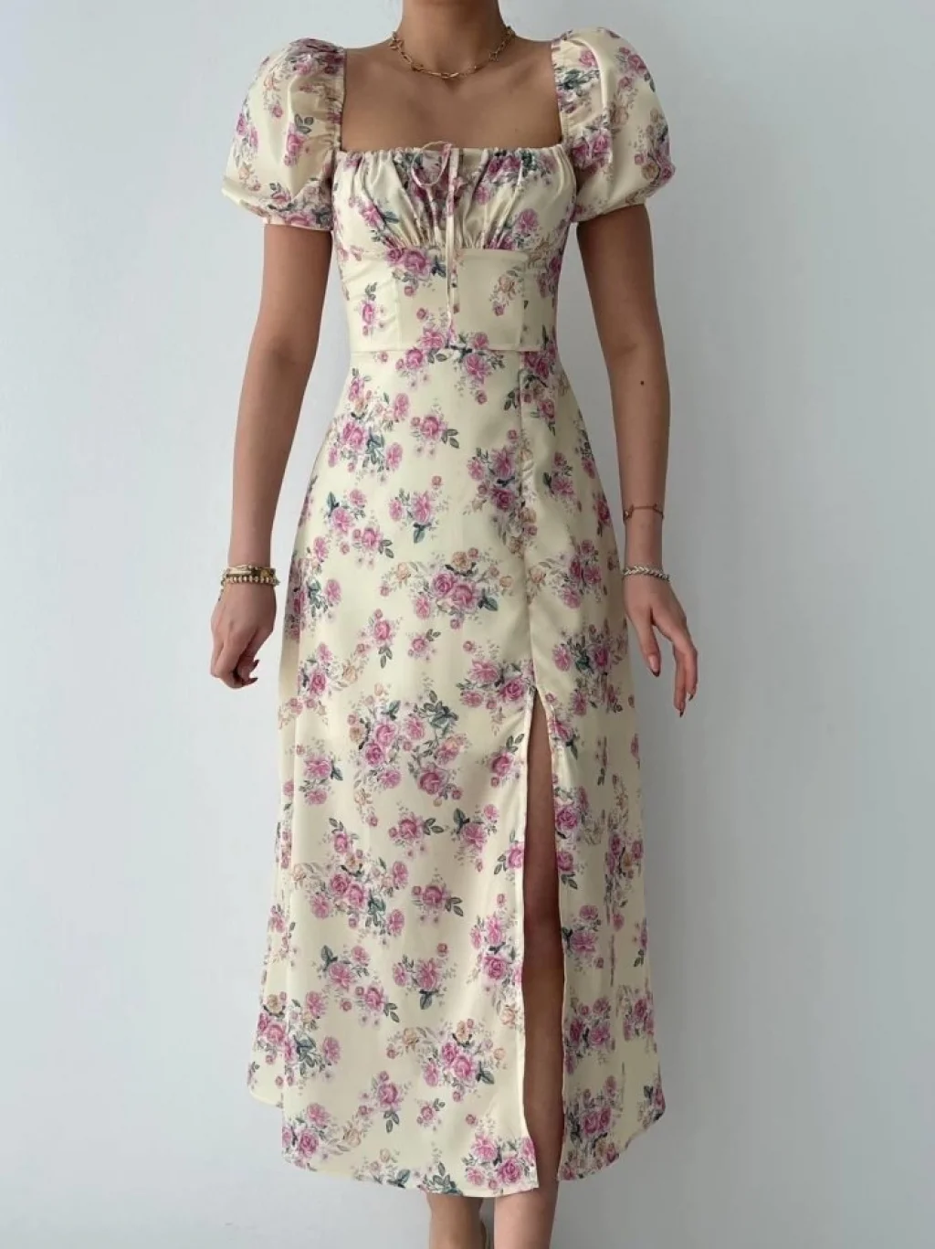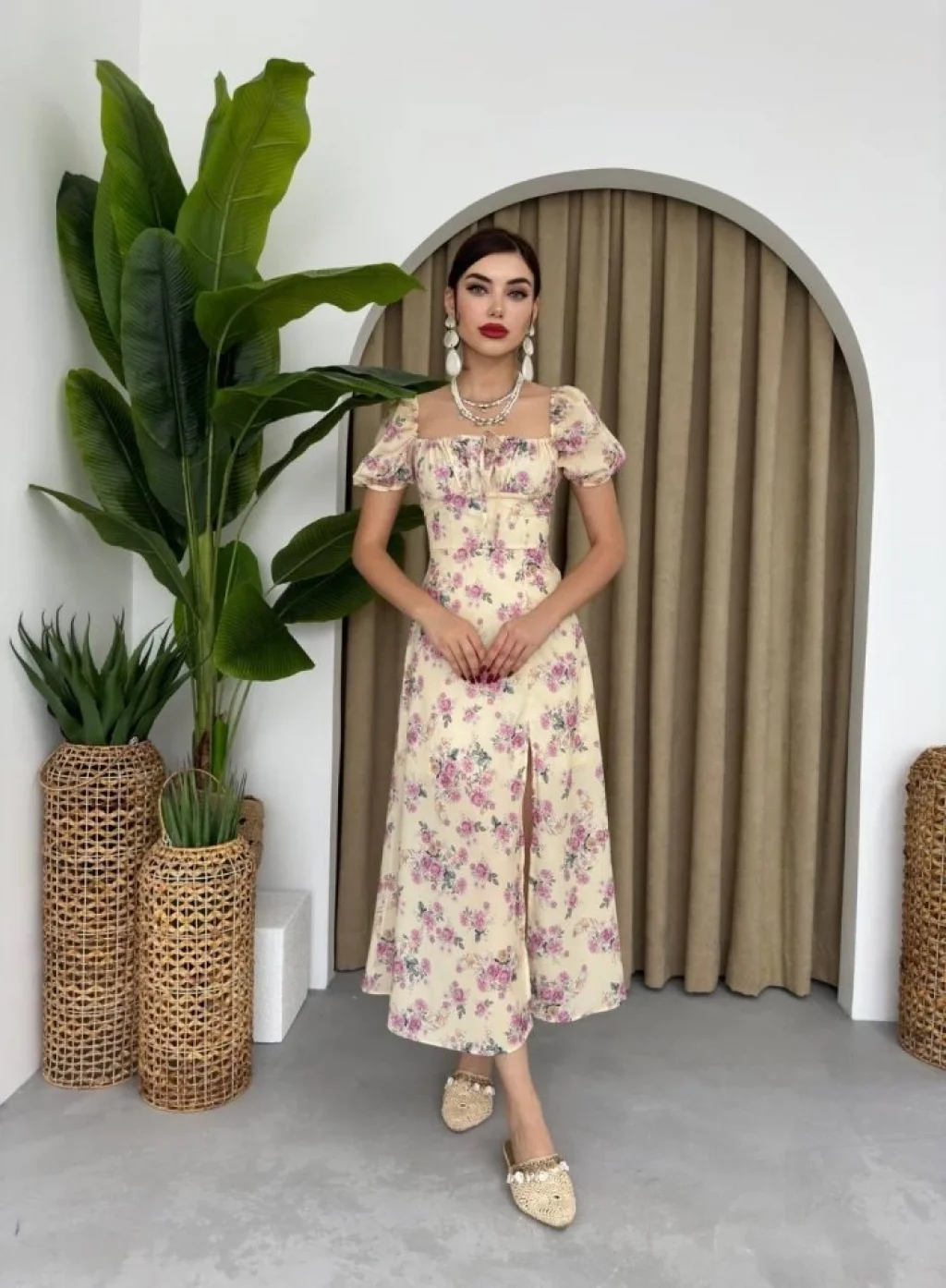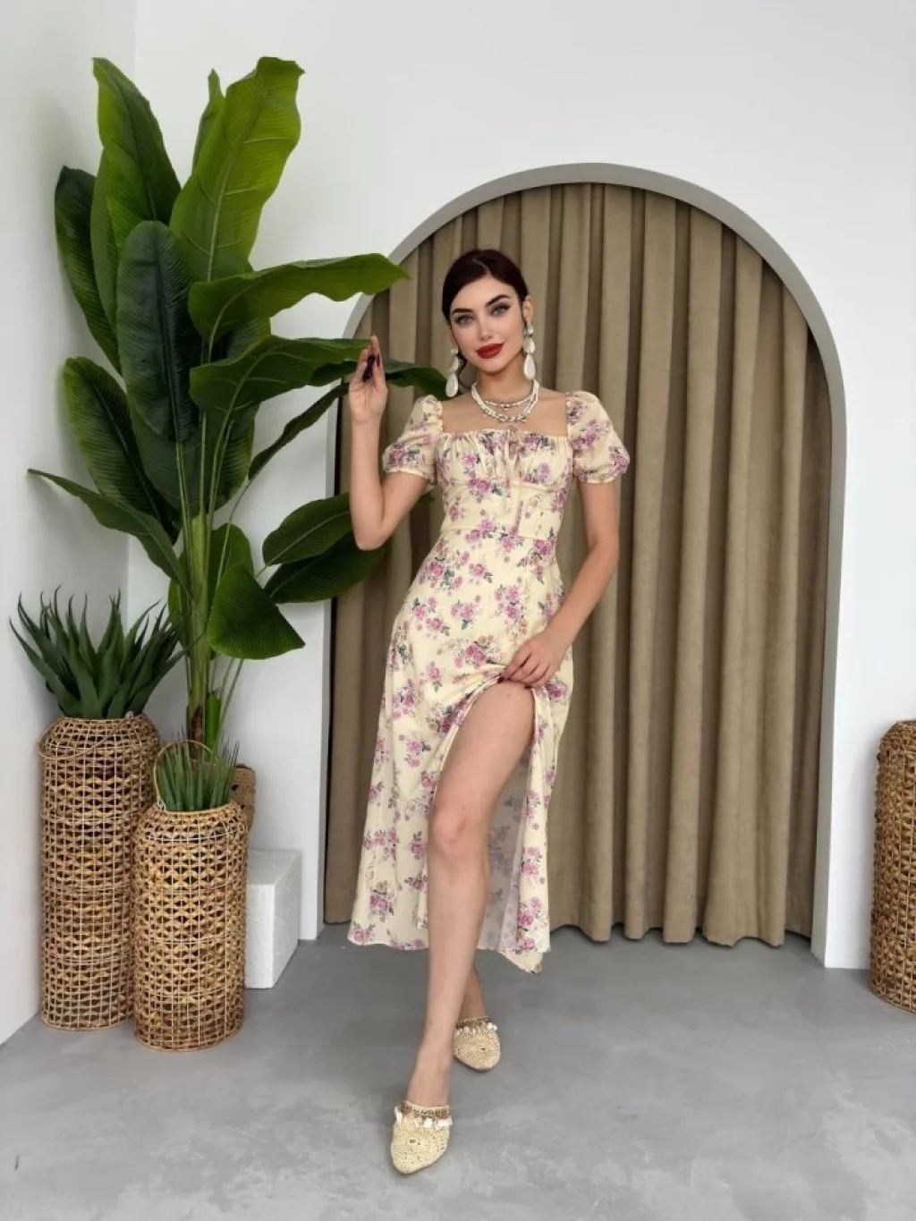 Kadın Kısa Kollu Içi Atlet Görünümlü Yandan Yırtmaçlı Uzun Viskon Elbise