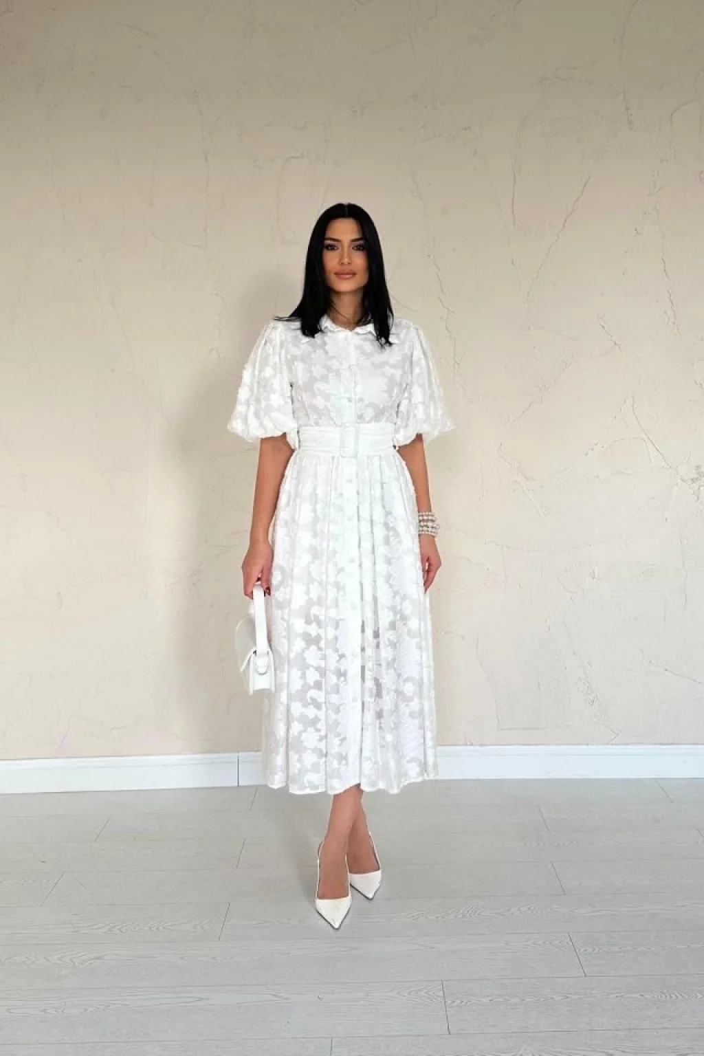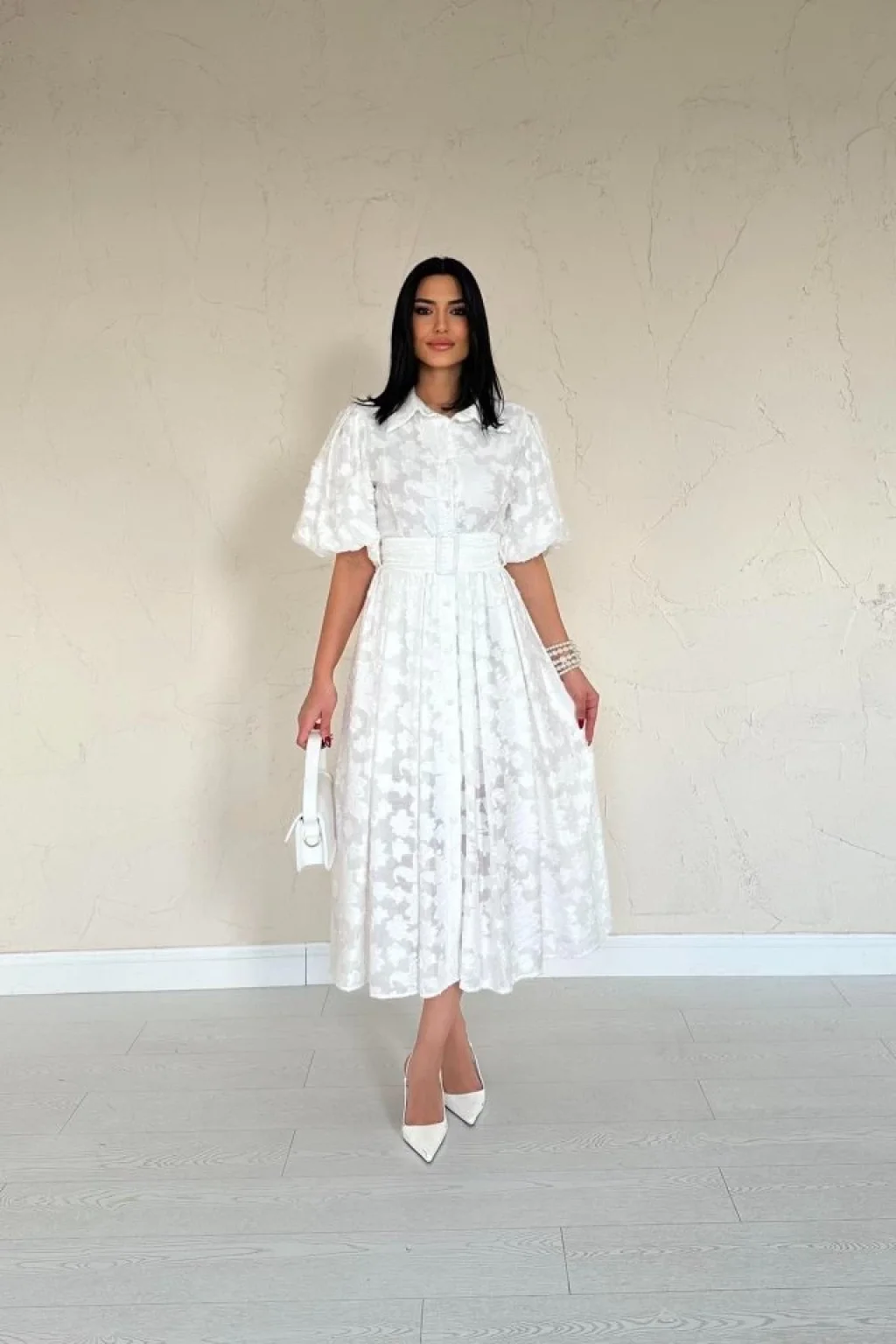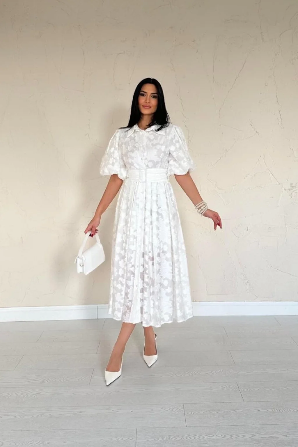 <p>Ekru Kemerli Balon Kollu Elbise</p><br> <p>Modelin Ölçüleri: Boy:165, Kg:55, Göğüs:90, Bel:72, Kalça: 100</p><br> <p>Modelin üzerindeki ürün M/38 bedendir</p><br> <ul> </ul>