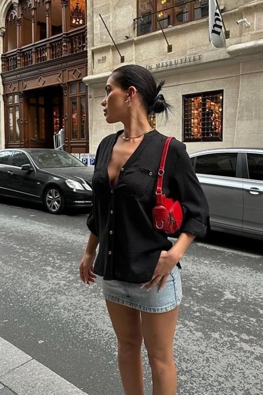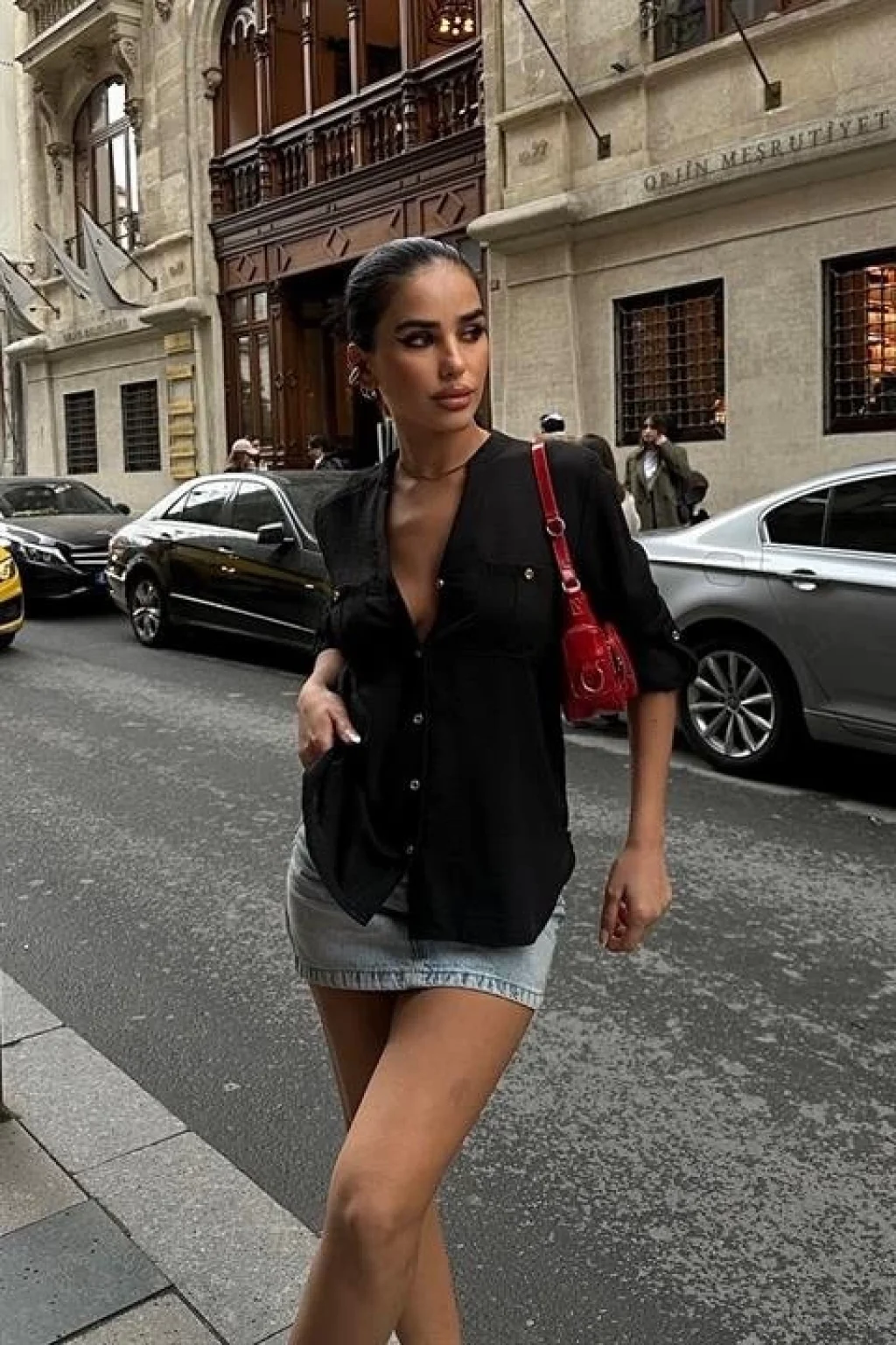 Kadın Dokuma Viskon Kumaş V Yaka Dekolte Ve Metal Düğme Detaylı Gömlek