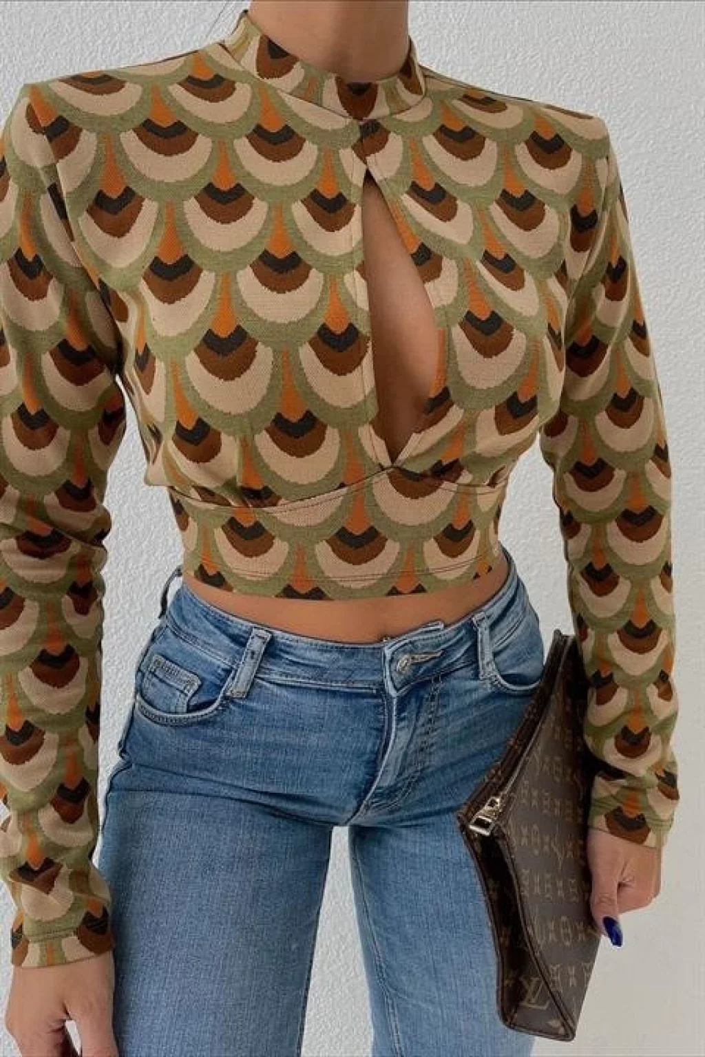 Kadın Uzun Kollu Hakim Yaka Yakadan Fermuarlı Geometrik Desenli Süprem Bluz