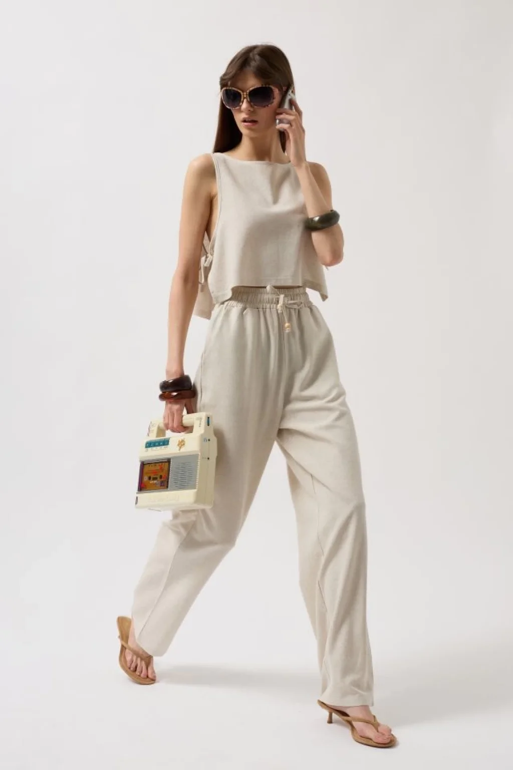 Kadın Belde Bağcık Detaylı Keten Bluz