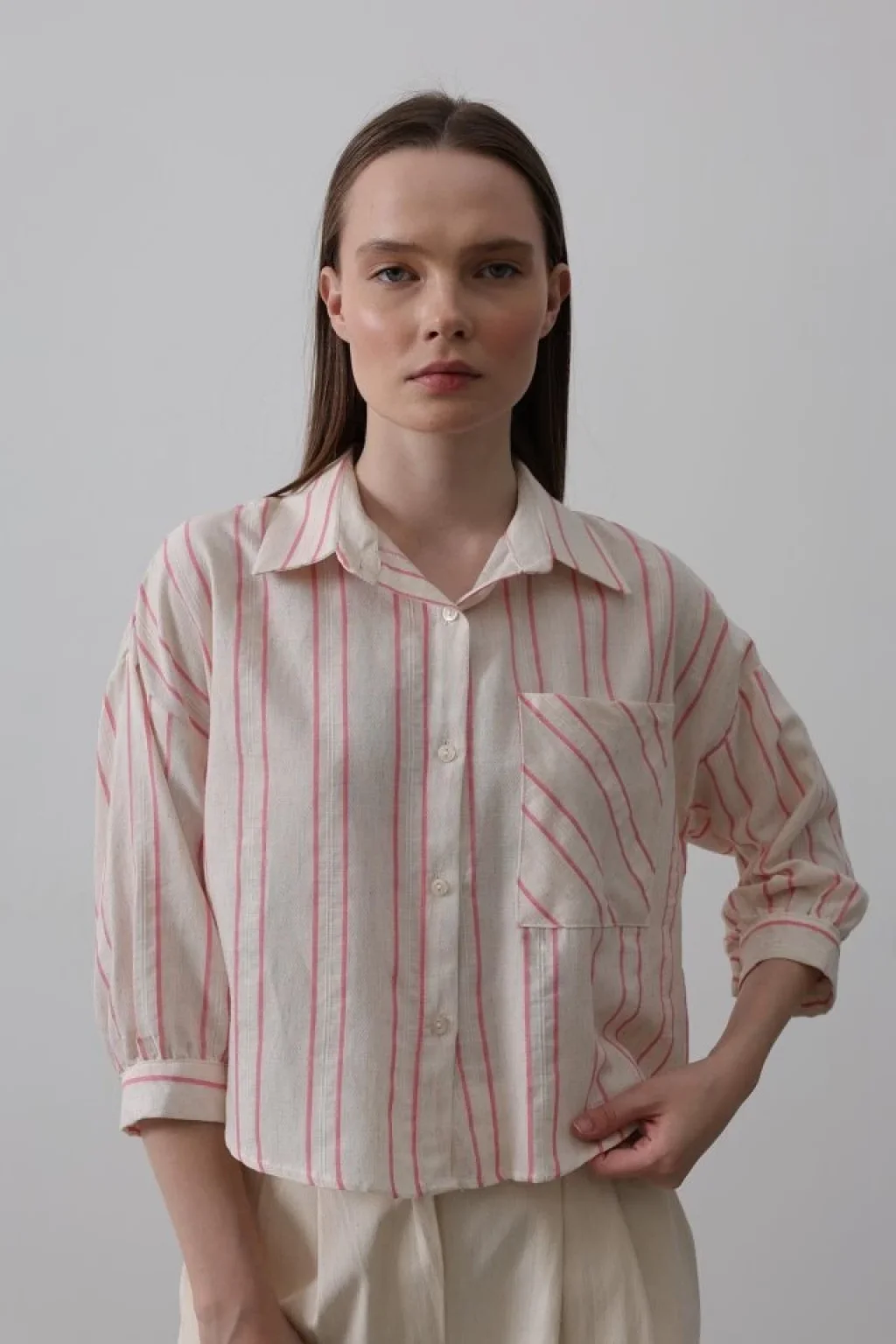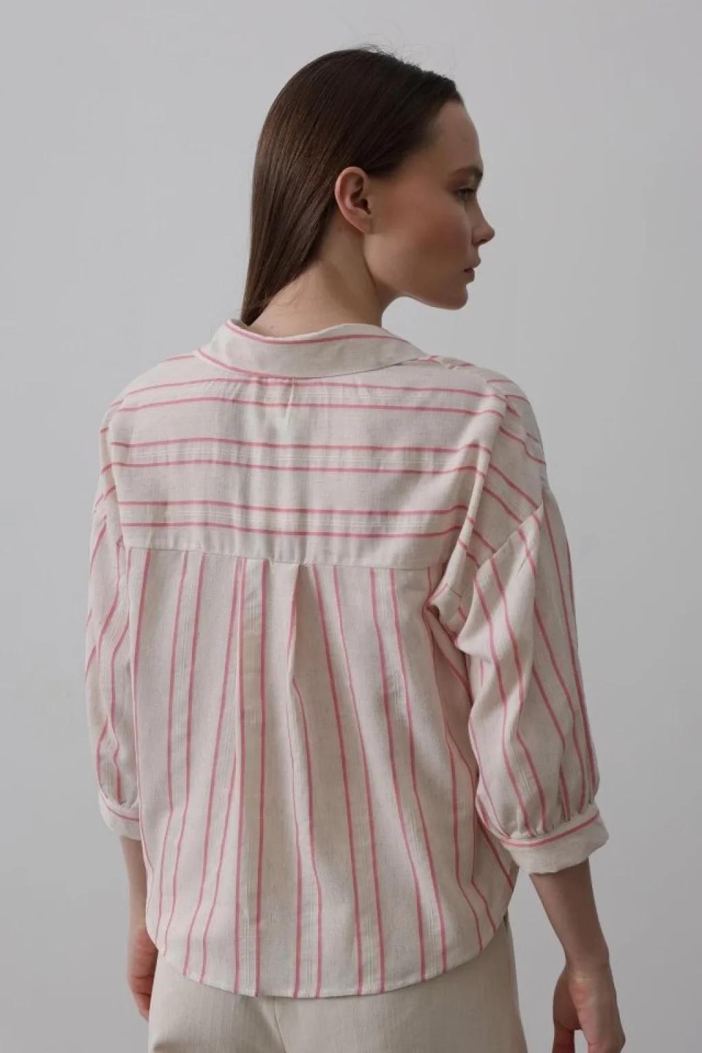 <p>Çizgili Kısa Gömlek - Bej Pembe</p><br> <p>Modelin Ölçüleri: Boy:165, Kg:55, Göğüs:90, Bel:72, Kalça: 100</p><br> <p>Modelin üzerindeki ürün M/38 bedendir</p><br> <ul> </ul>