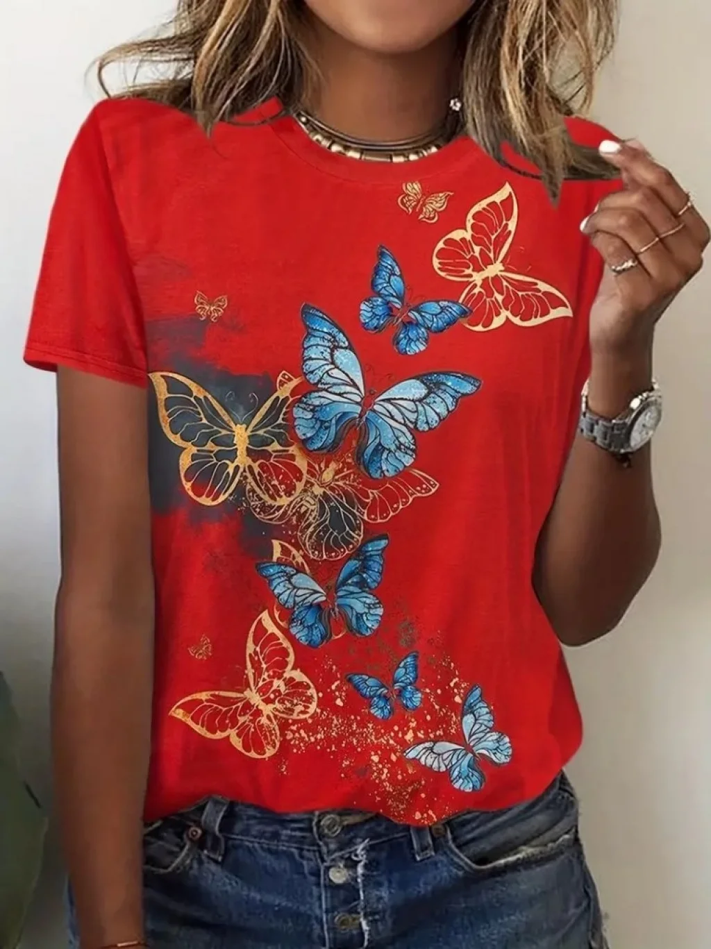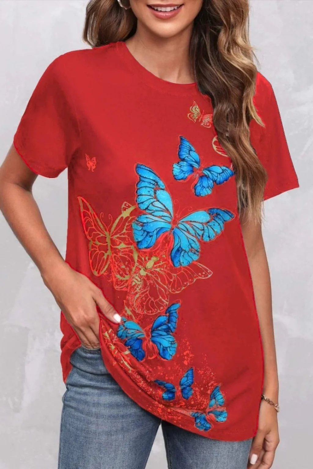 Kadın Kısa Kollu Mavi Sarı Kelebek Baskı Süprem Bluz
