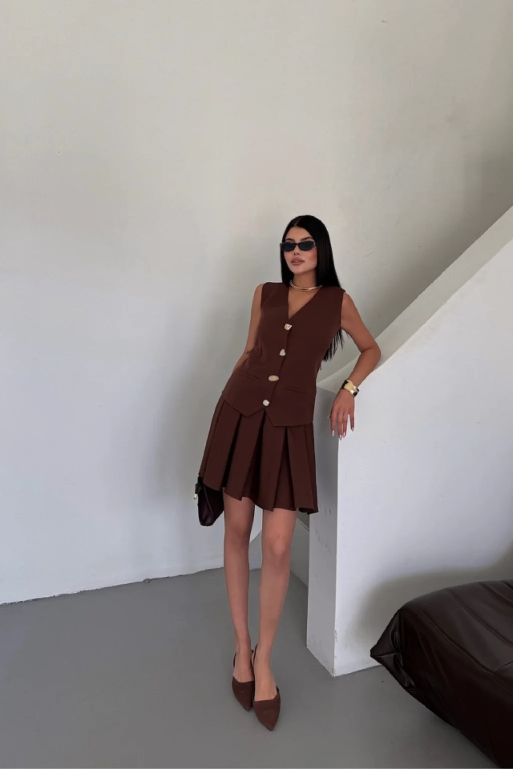 YELEK - PİLELİ ETEK GÖRÜNÜMLÜ ELBİSE - Kahverengi