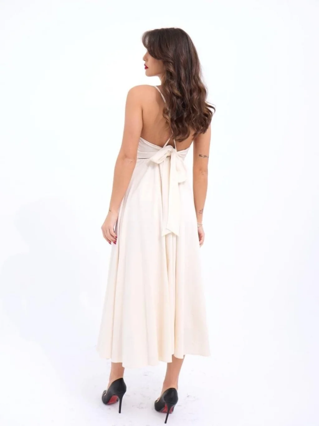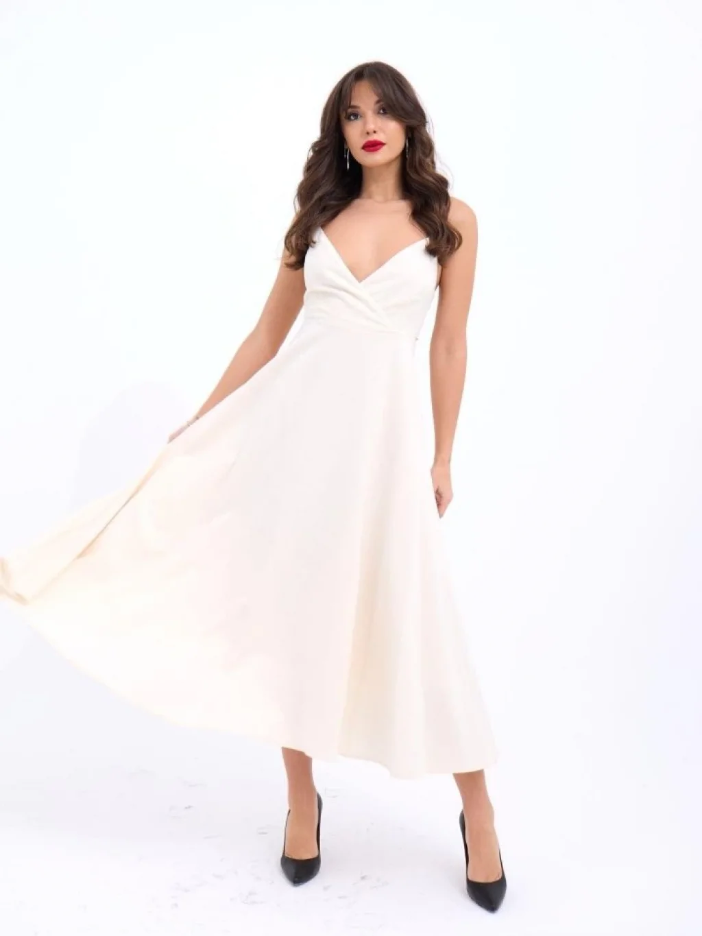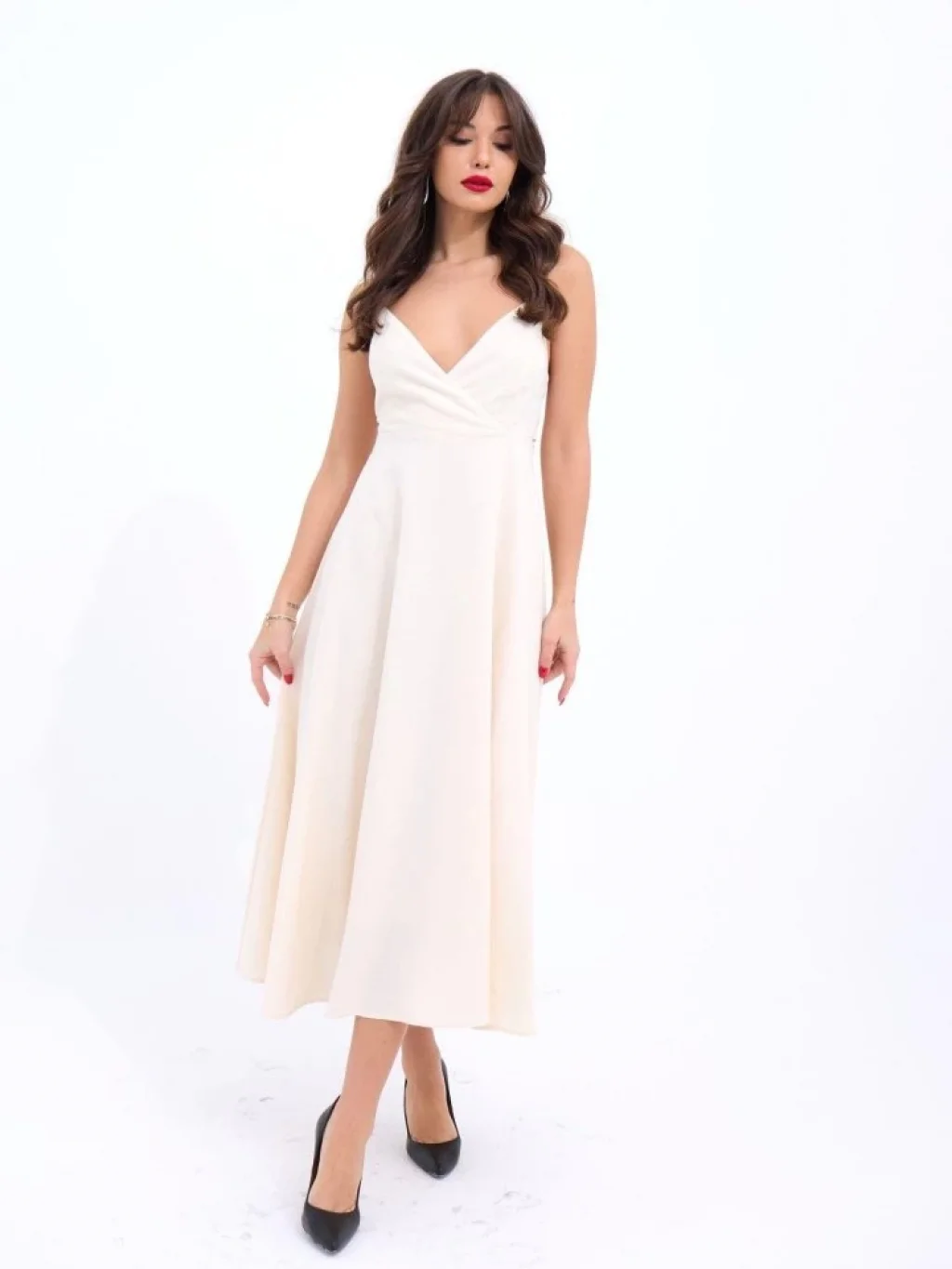 Kadın Kare Yaka Omuz Askılı Sırt Dekoltesi Detay Büzgülü Sandy Kumaş Mini Elbise