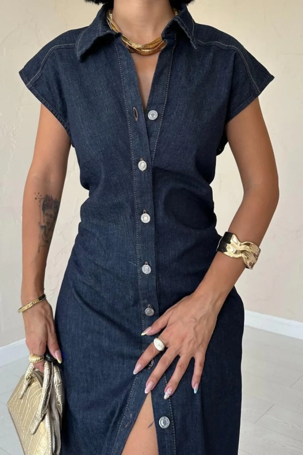 Kadın Uzun Kollu Kruvaze Yakalı önden Düğmeli Kısa Ithal Krep Elbise