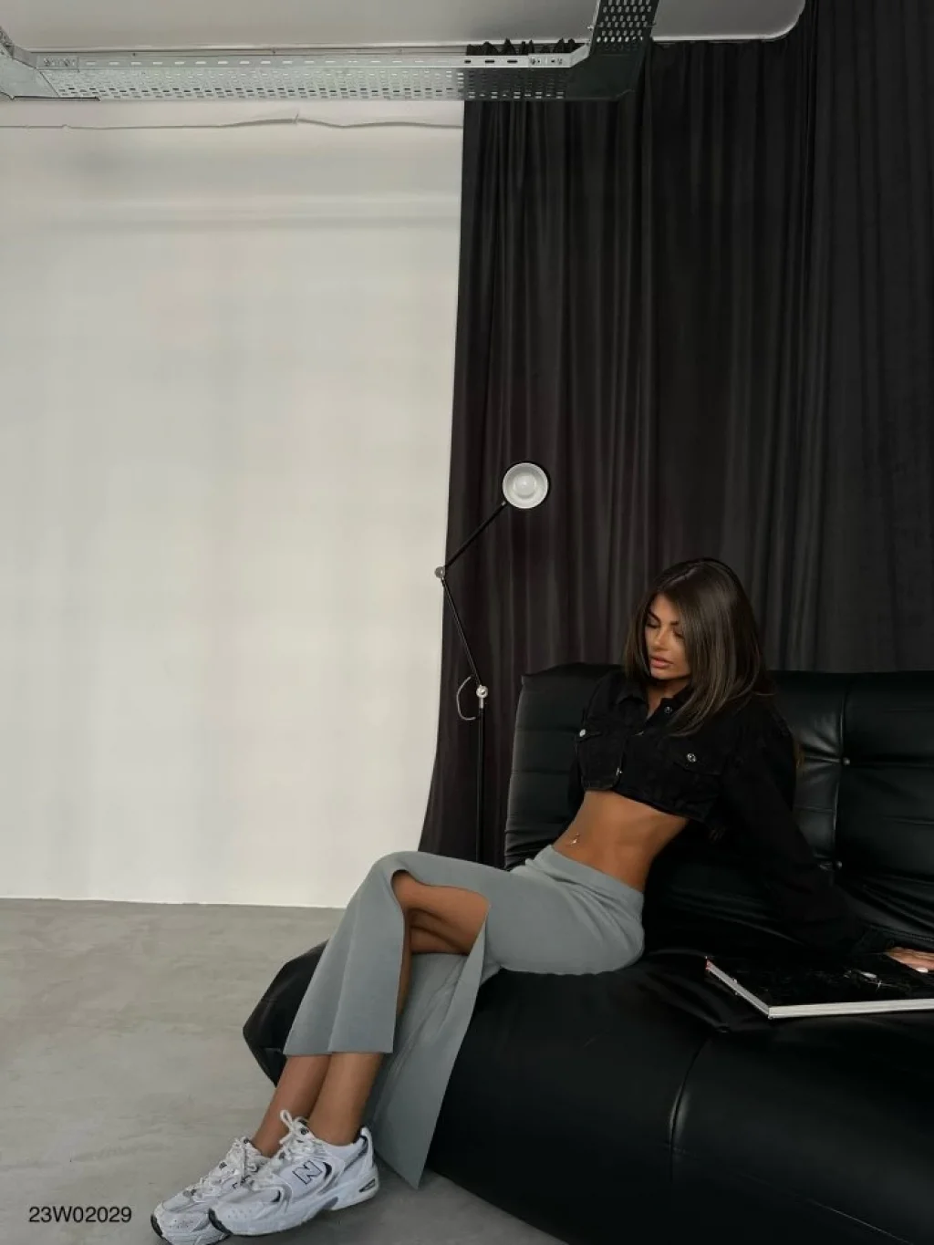 Kadın Yüksek Bel önden Yırtmaçlı Cepli Midi Kot Etek