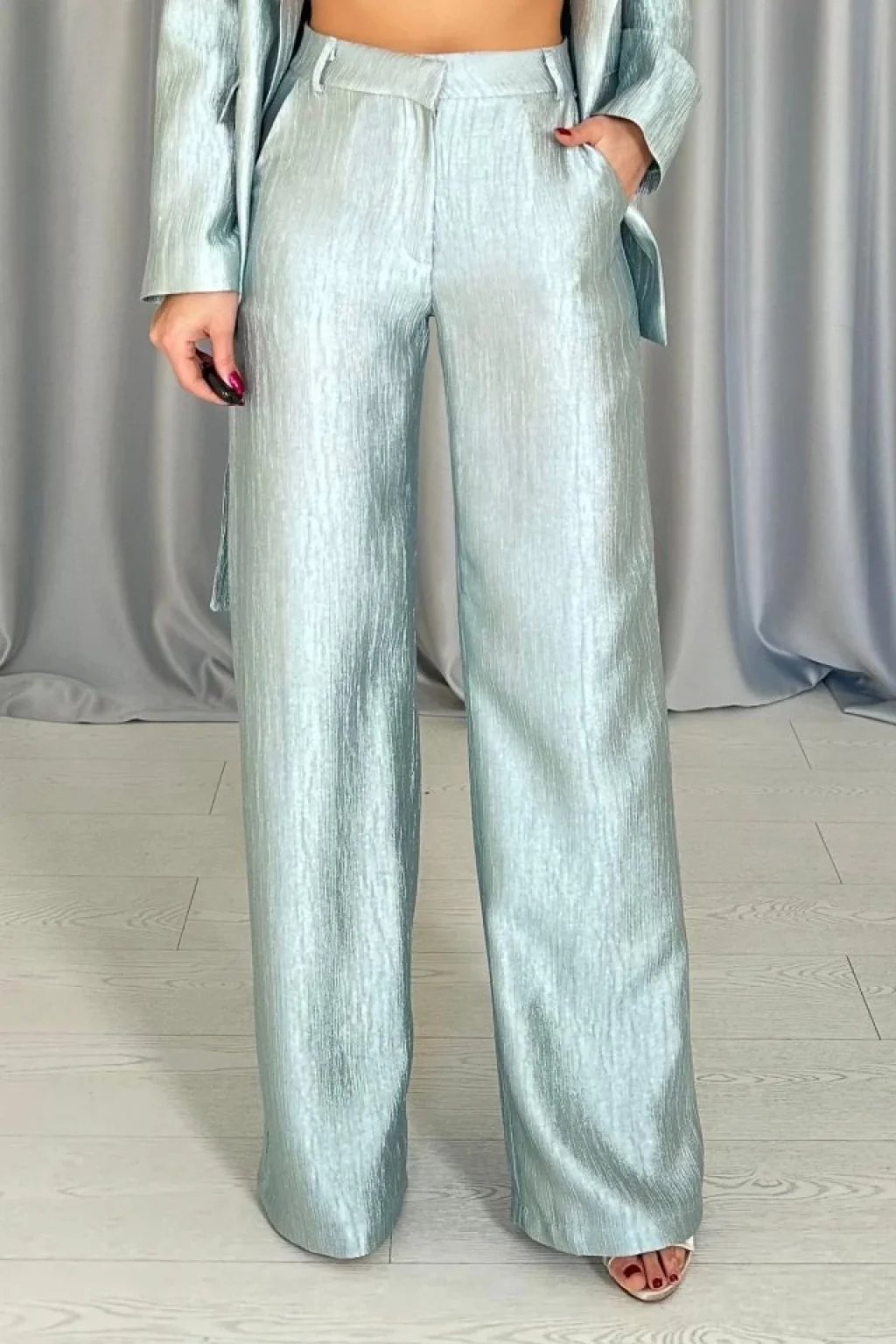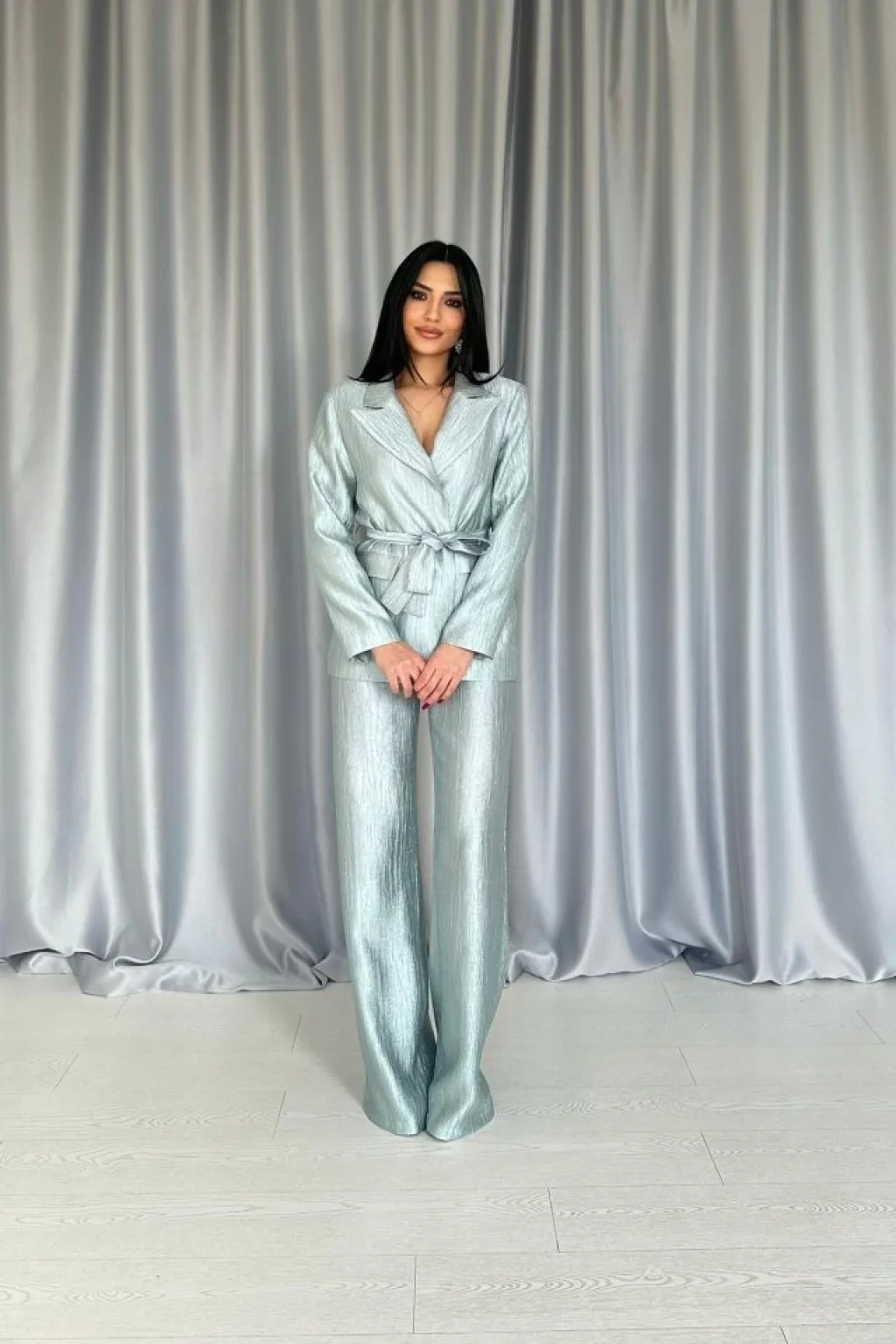 Mint Beli Kuşaklı Ceket Ve Pantolon Parlak Takım