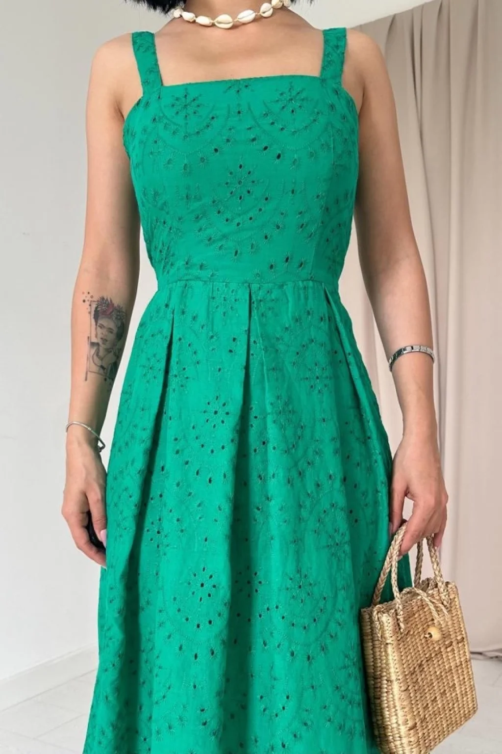 Yeşil Askılı Aparatlı Brode Elbise