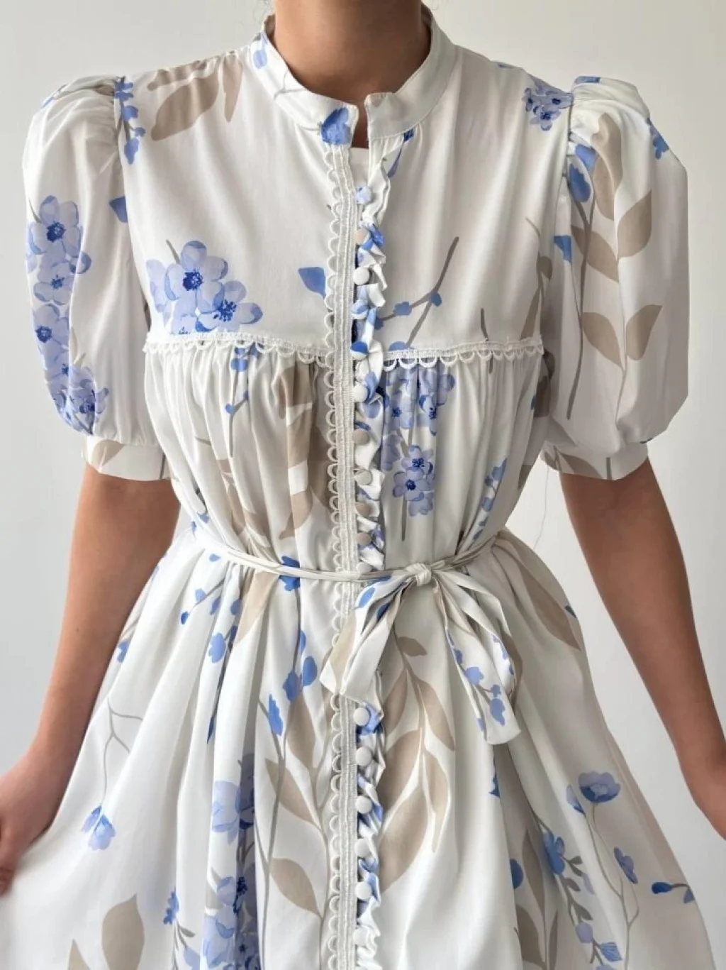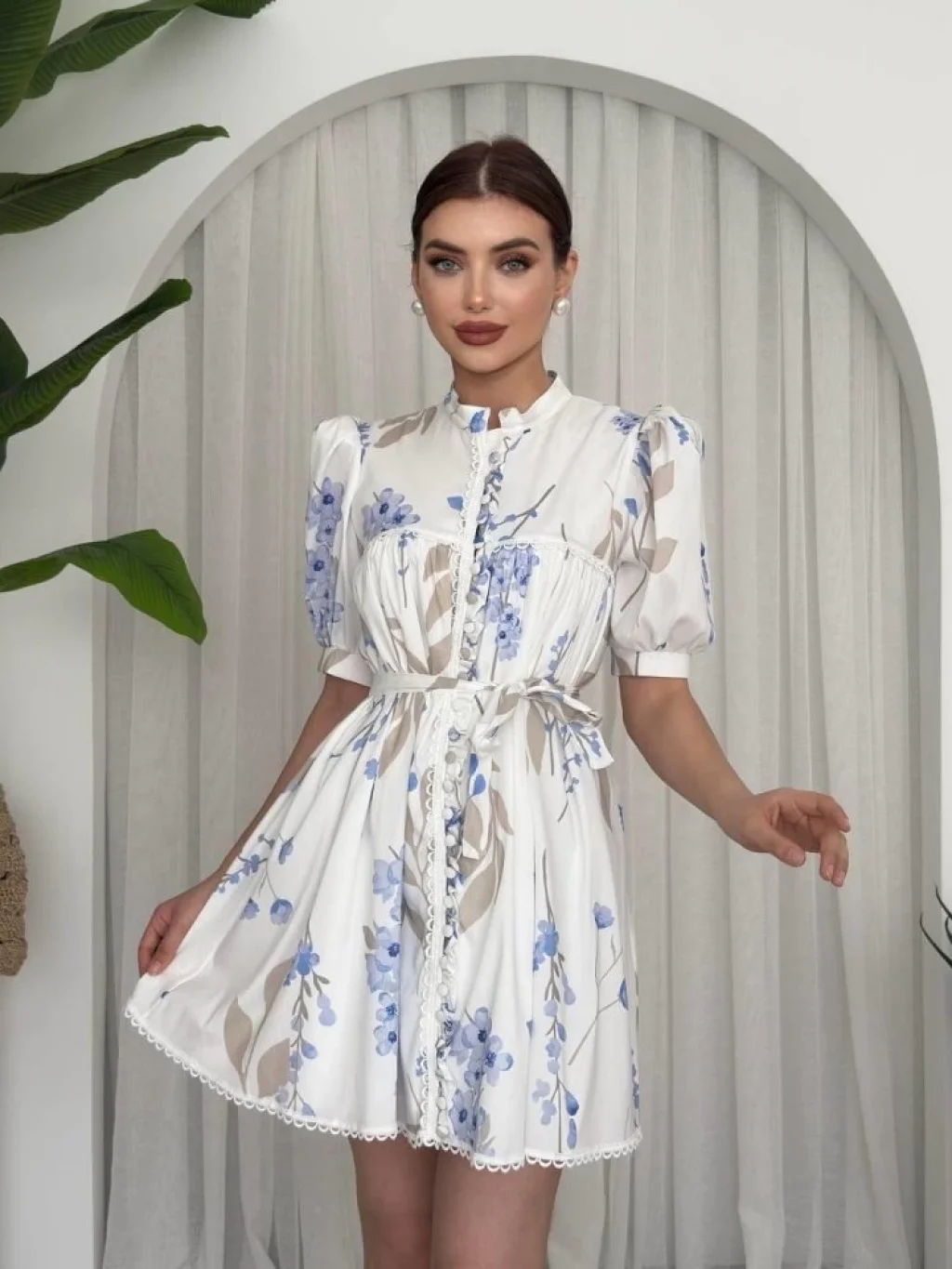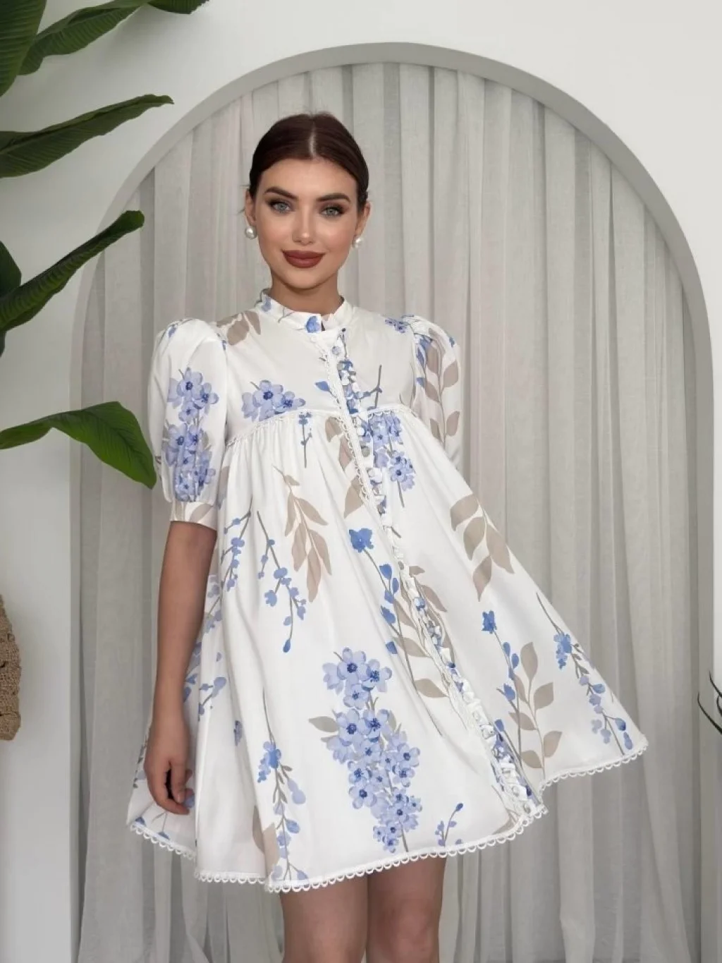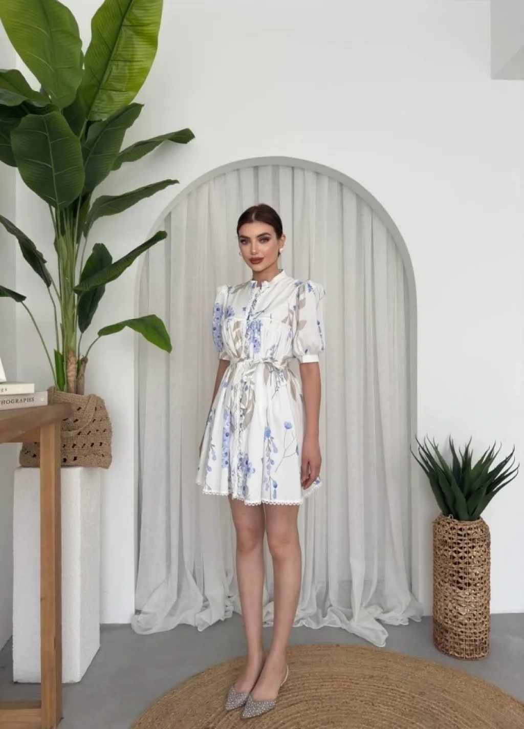 Desenli Kısa Kol Elbise 2558 - Mavi