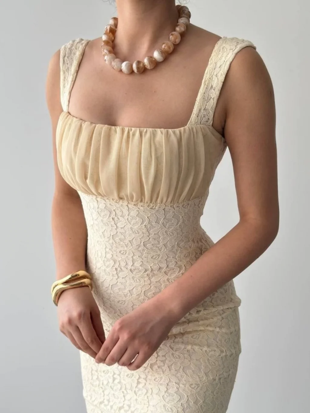 Kadın Kare Yaka Omuz Askılı Sırt Dekoltesi Detay Büzgülü Sandy Kumaş Mini Elbise