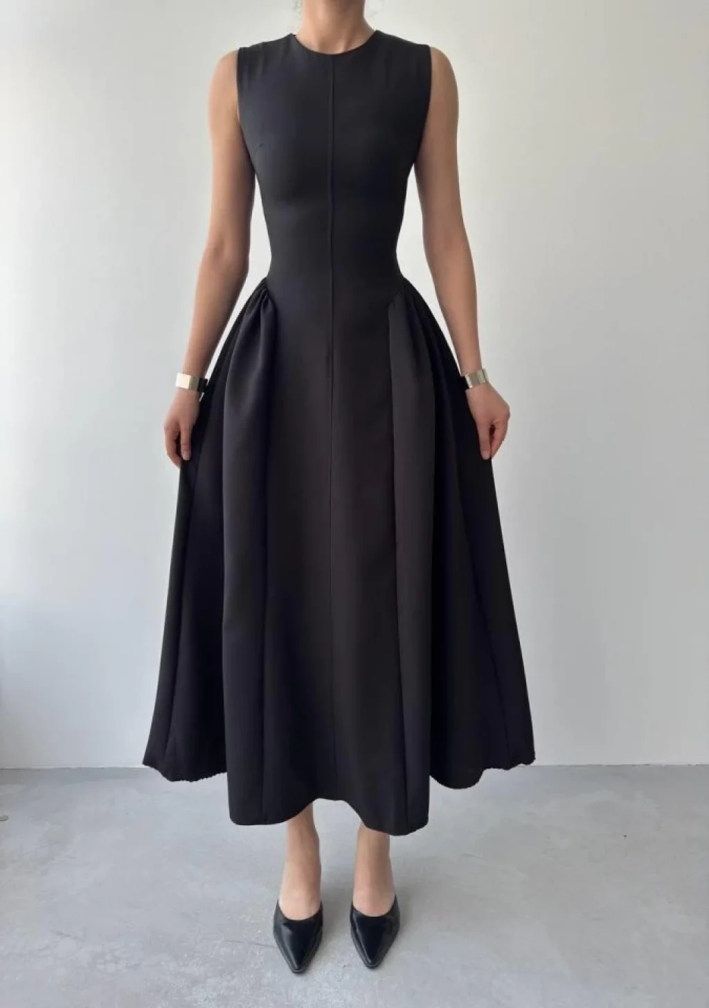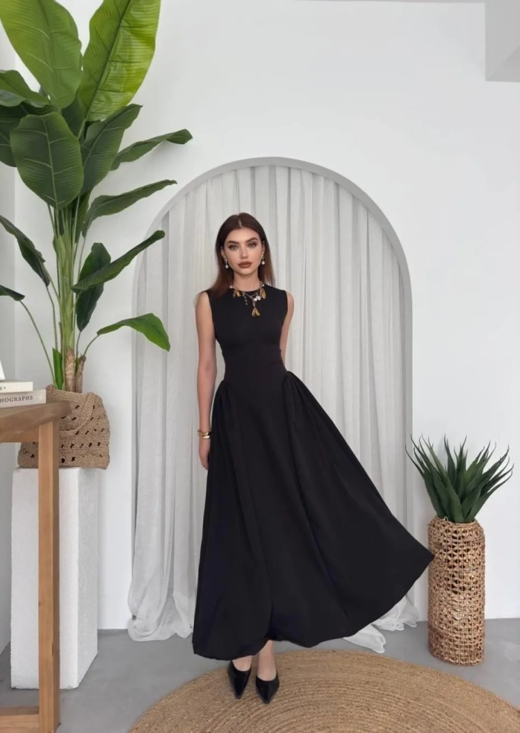 Kadın Kısa Kollu V Yakalı Pileli Uzun Janjan Krep Elbise
