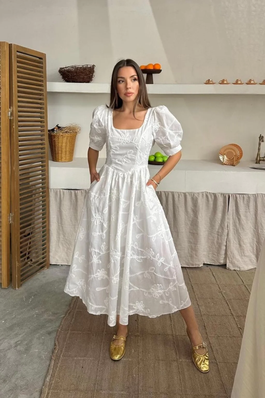 <p>Beyaz Balon Kollu Brode Elbise</p><br> <p>Modelin Ölçüleri: Boy:165, Kg:55, Göğüs:90, Bel:72, Kalça: 100</p><br> <p>Modelin üzerindeki ürün M/38 bedendir</p><br> <ul> </ul>