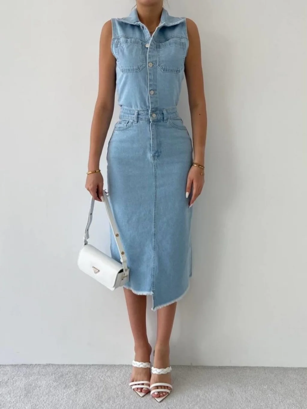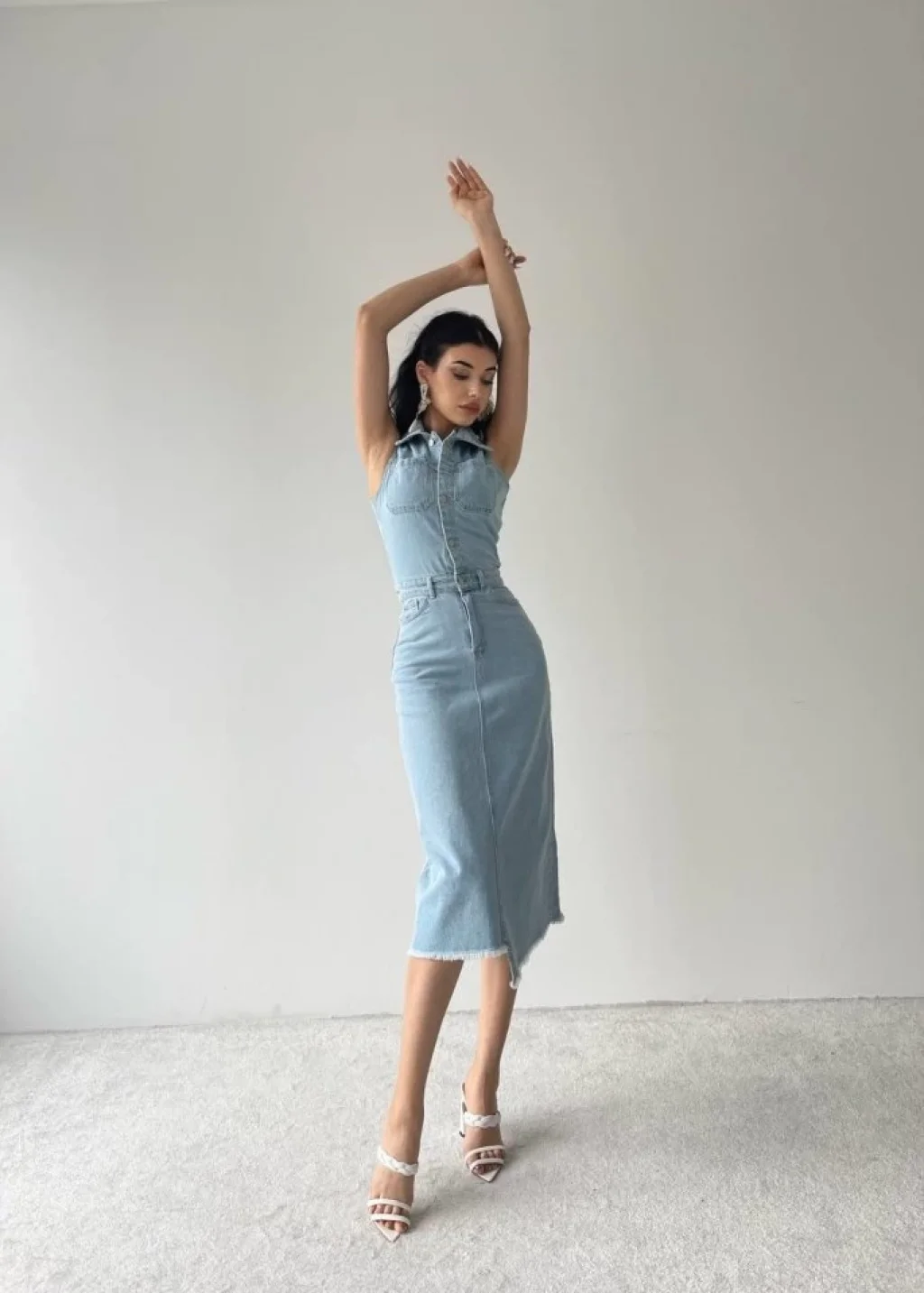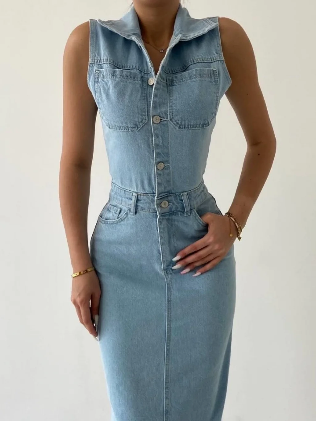 <p>Meldia Jean Sıfır Kollu Elbise</p><br> <p>Modelin Ölçüleri: Boy:165, Kg:55, Göğüs:90, Bel:72, Kalça: 100</p><br> <p>Modelin üzerindeki ürün M/38 bedendir</p><br> <ul> </ul>
