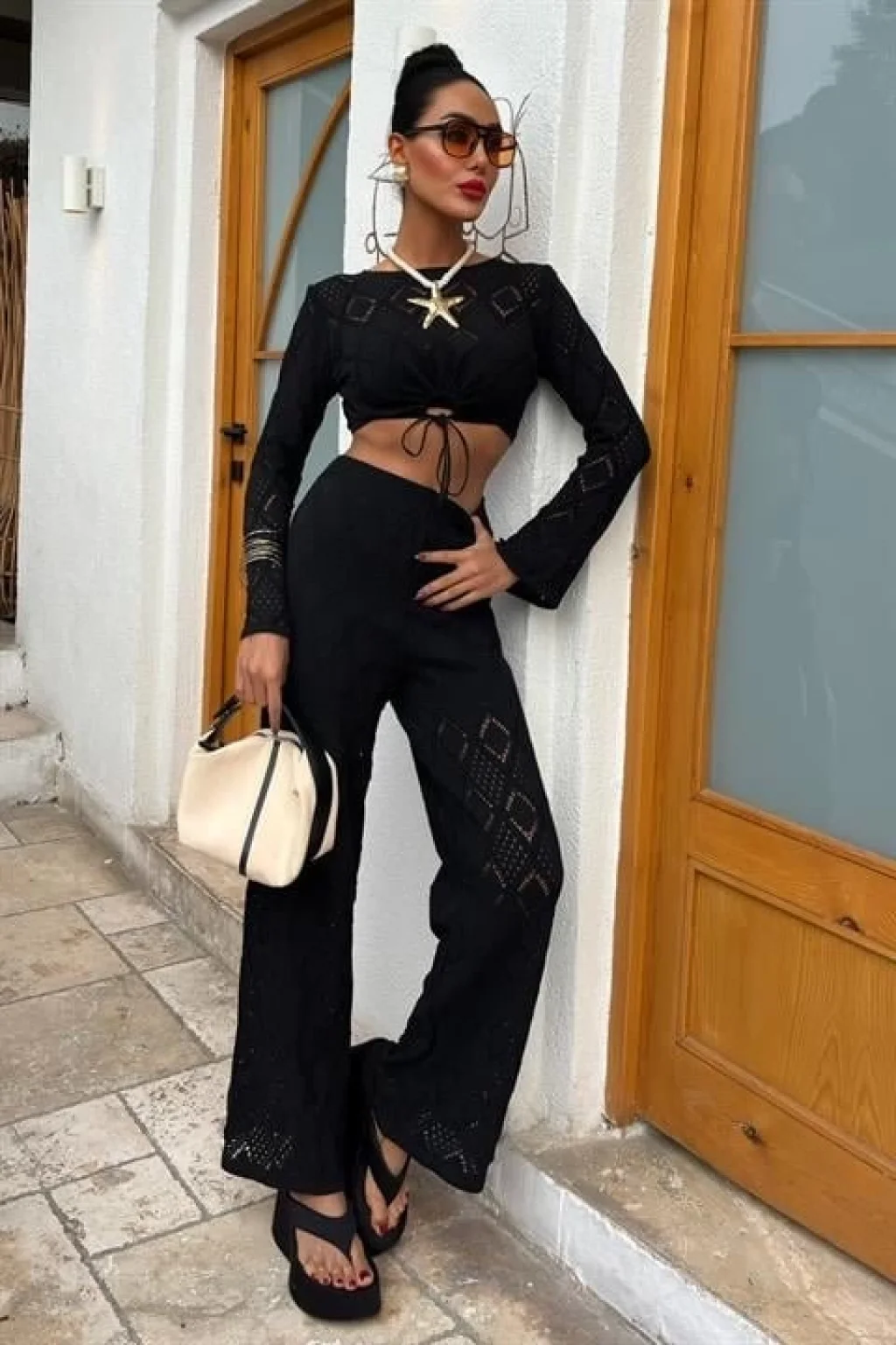 Göğüs Bağcık Detaylı Ajurlu Bluz Pantolon Takım 10098