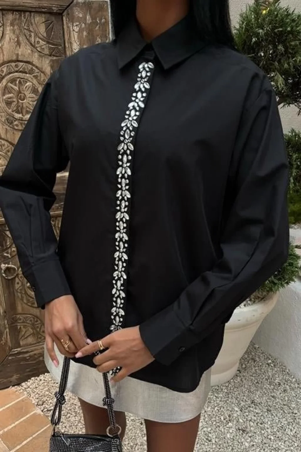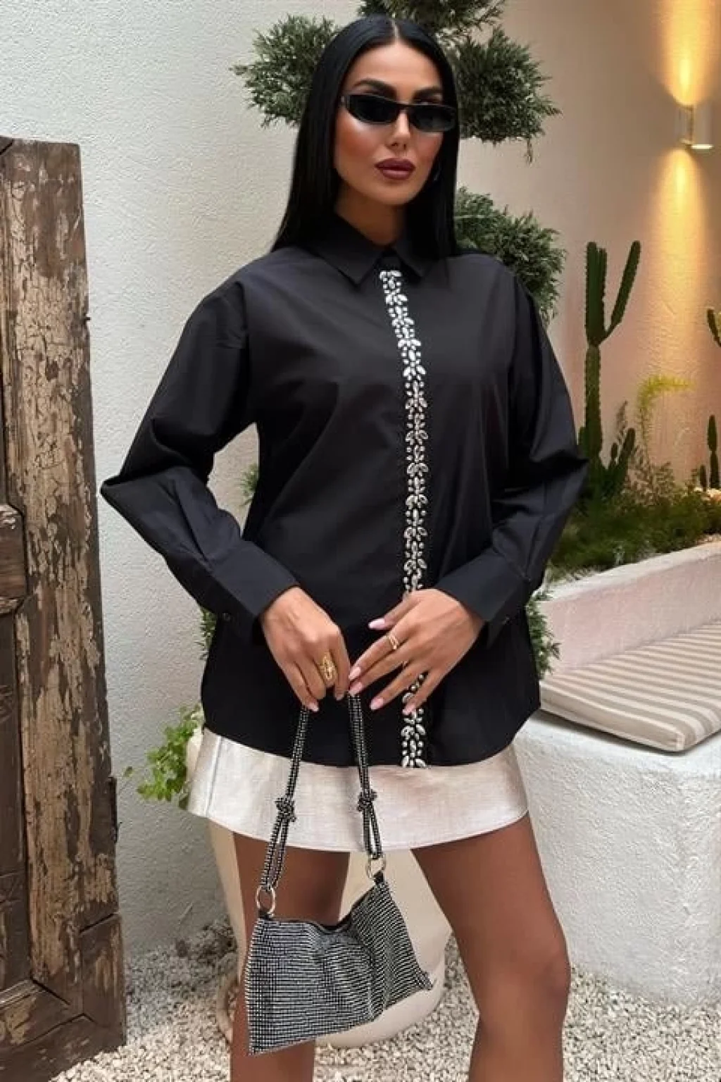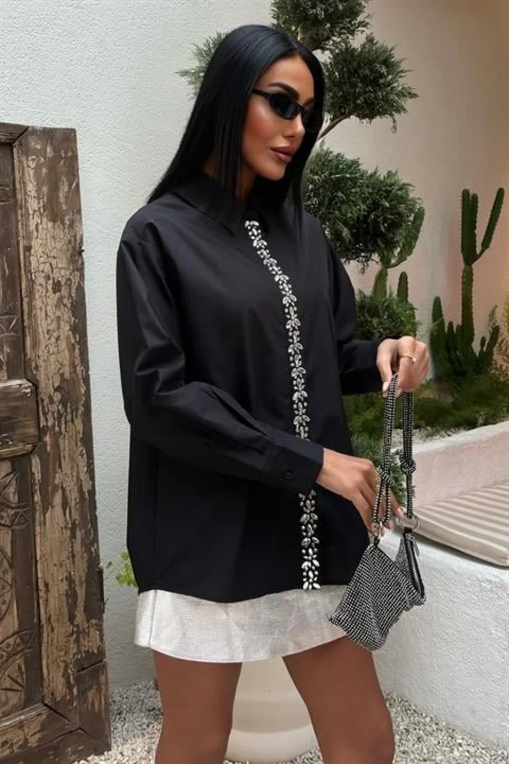 <p>Önü Şerit Taşlı Gömlek 3448</p><br> <p>Modelin Ölçüleri: Boy:165, Kg:55, Göğüs:90, Bel:72, Kalça: 100</p><br> <p>Modelin üzerindeki ürün M/38 bedendir</p><br> <ul> </ul>