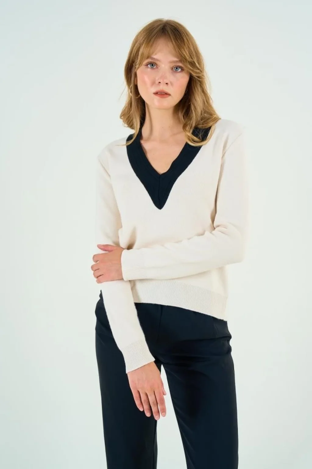 <p>V Yaka Triko Kazak - Krem-Siyah</p><br> <p>Modelin Ölçüleri: Boy:165, Kg:55, Göğüs:90, Bel:72, Kalça: 100</p><br> <p>Modelin üzerindeki ürün M/38 bedendir</p><br> <ul> </ul>