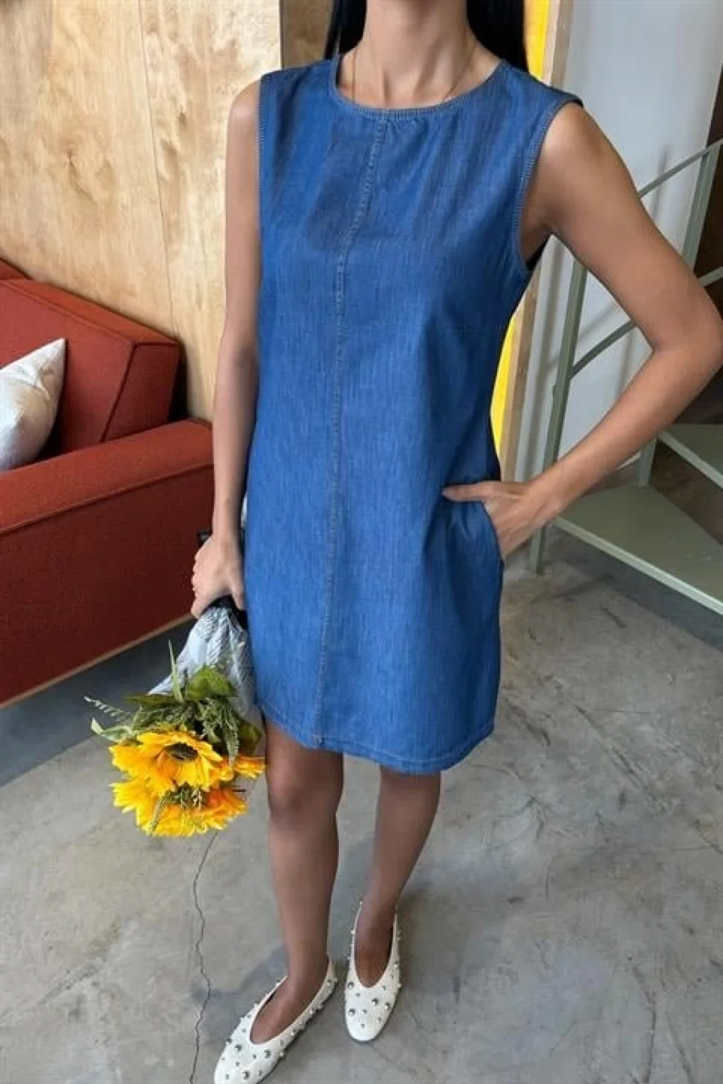 Kadın Kare Yaka Omuz Askılı Sırt Dekoltesi Detay Büzgülü Sandy Kumaş Mini Elbise