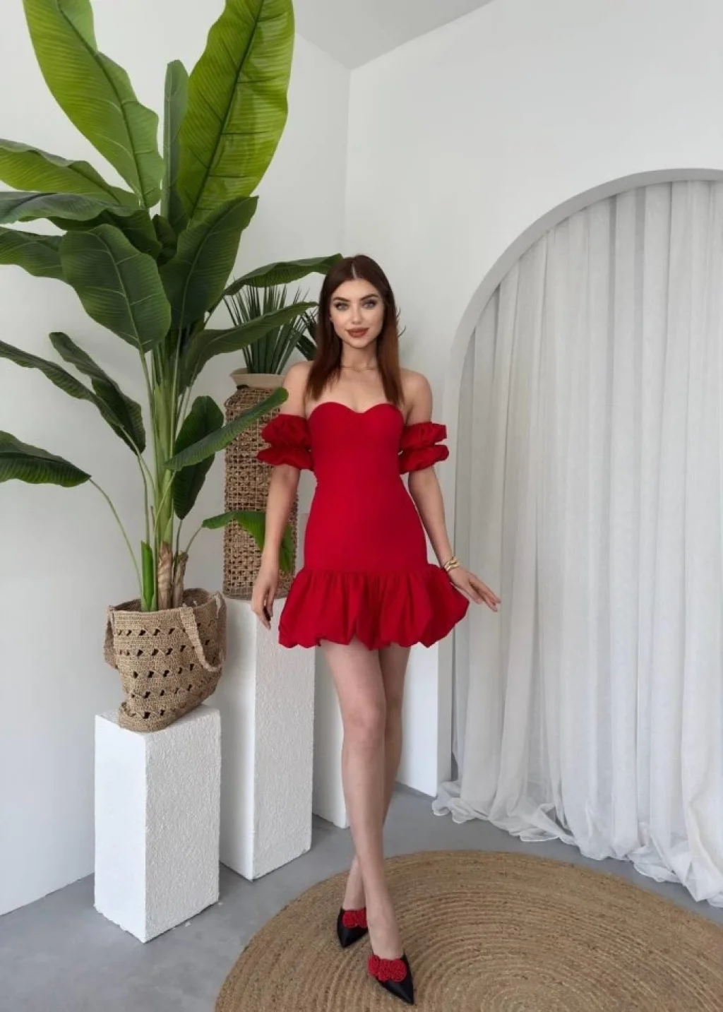 Kadın Kare Yaka Omuz Askılı Sırt Dekoltesi Detay Büzgülü Sandy Kumaş Mini Elbise