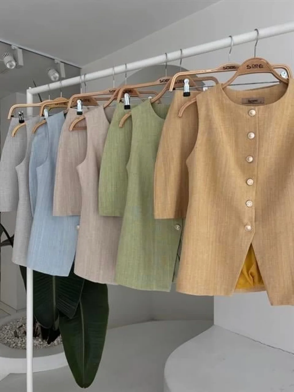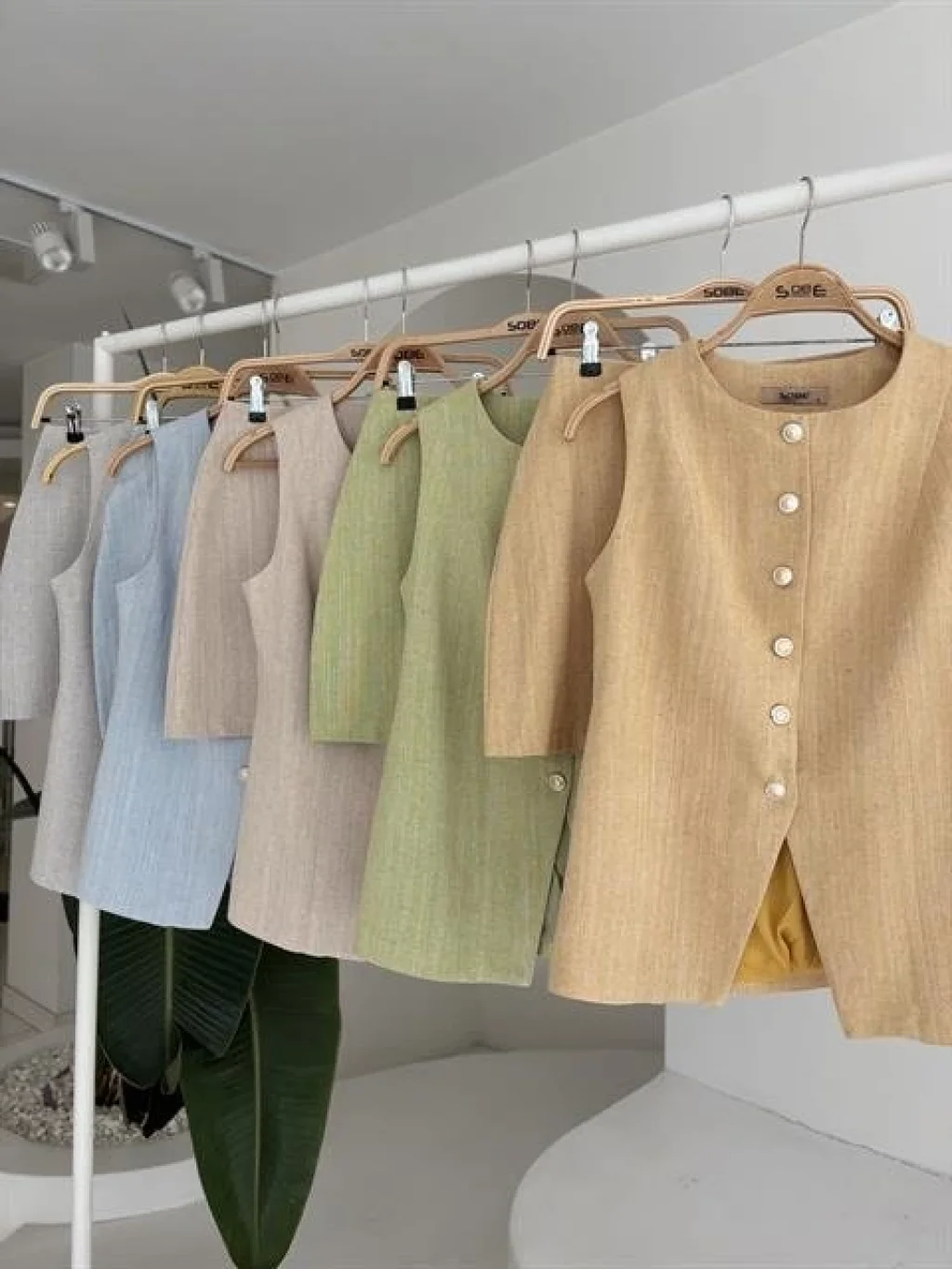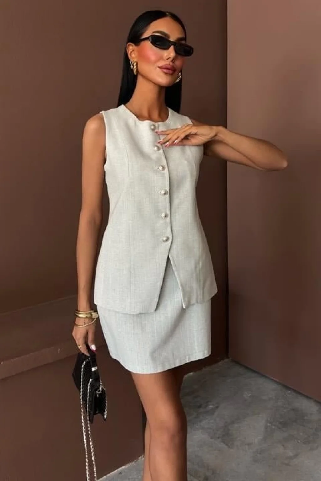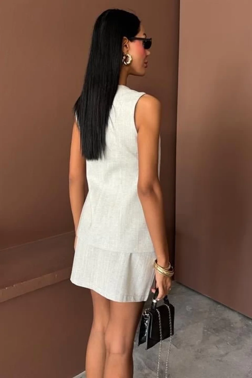 Uzun Yelek Mini Etek Flamlı Keten Takım 10148