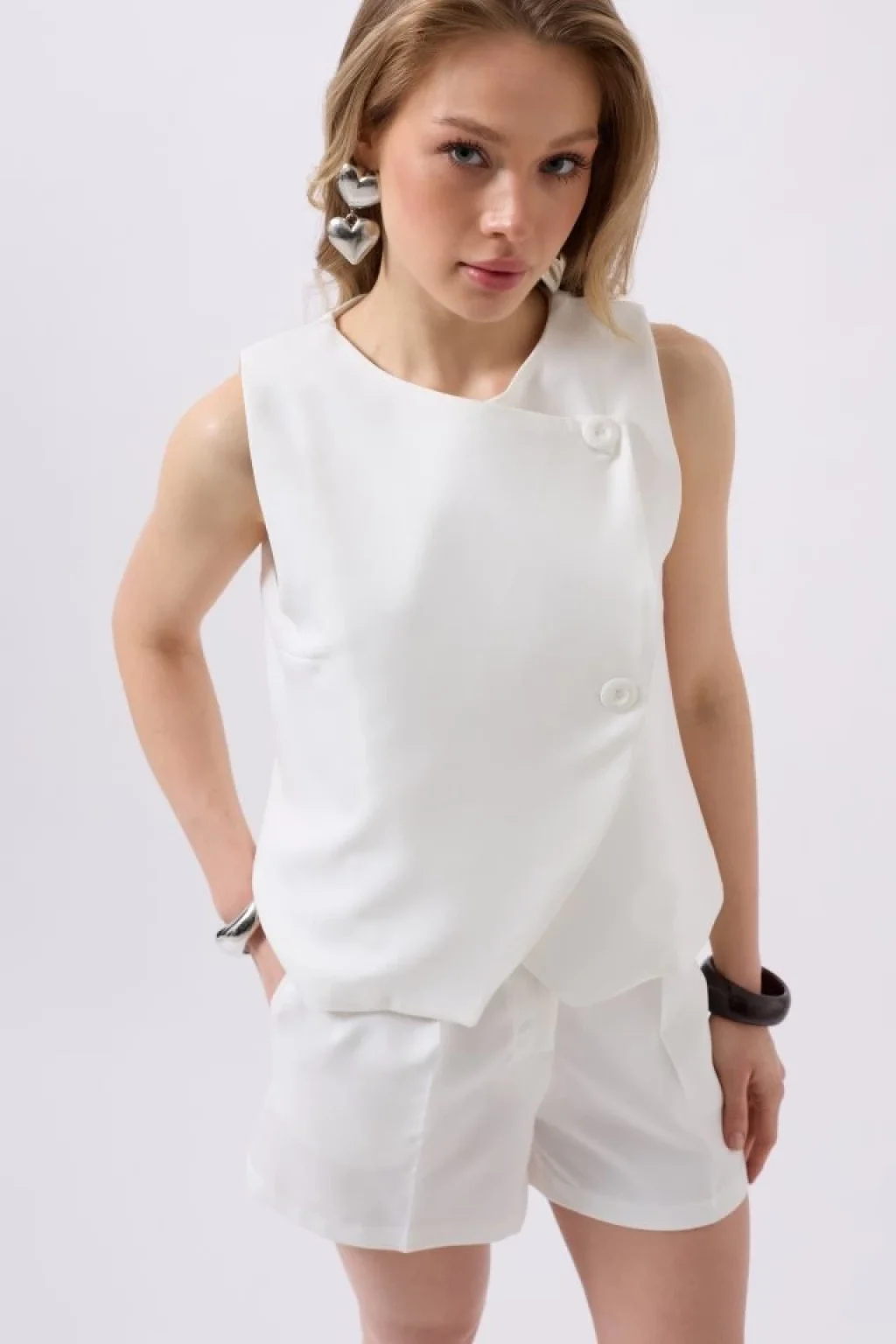 YAKA MİDYE KABUĞU SIRALI YELEK - PANTOLONTAKIM KETEN KUMAŞ - Beyaz