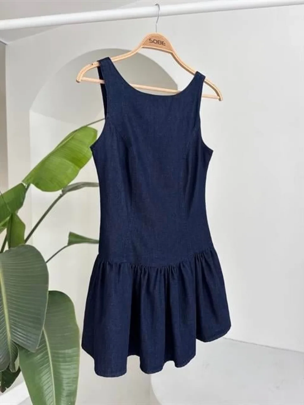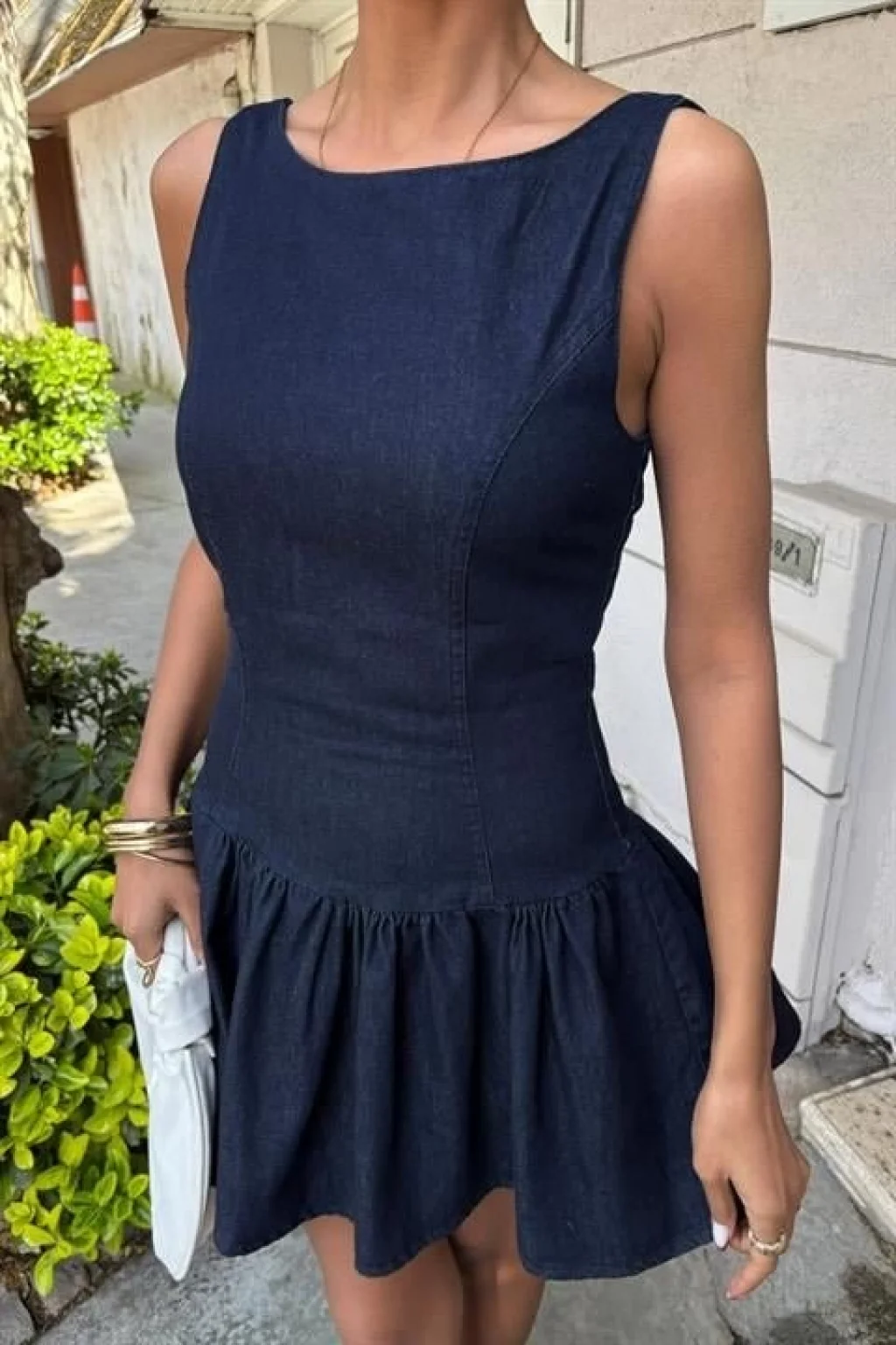 Kadın Kare Yaka Omuz Askılı Sırt Dekoltesi Detay Büzgülü Sandy Kumaş Mini Elbise
