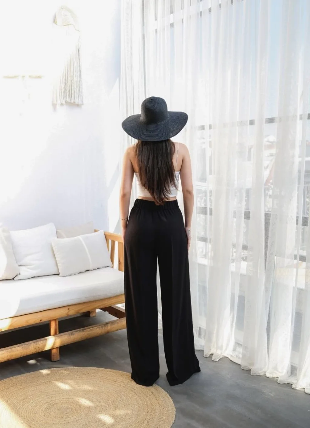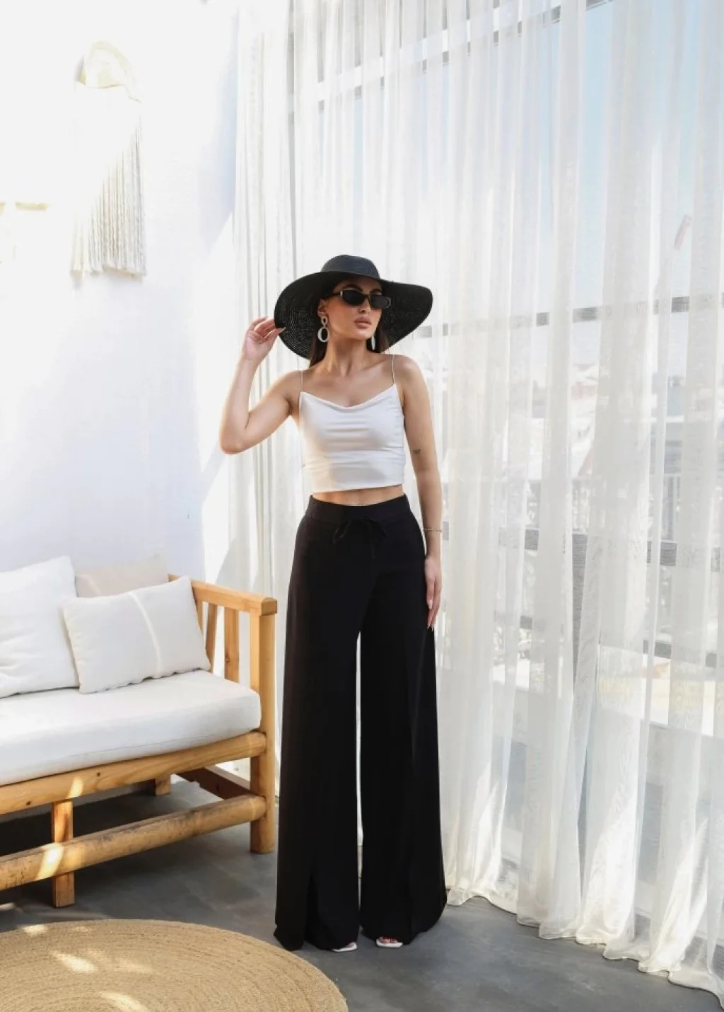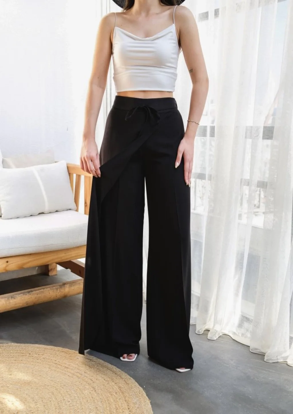 Keten Önü Çapraz Parçali Lasti̇kli̇ Ve Bağcikli Geni̇ş Paça Pantolon