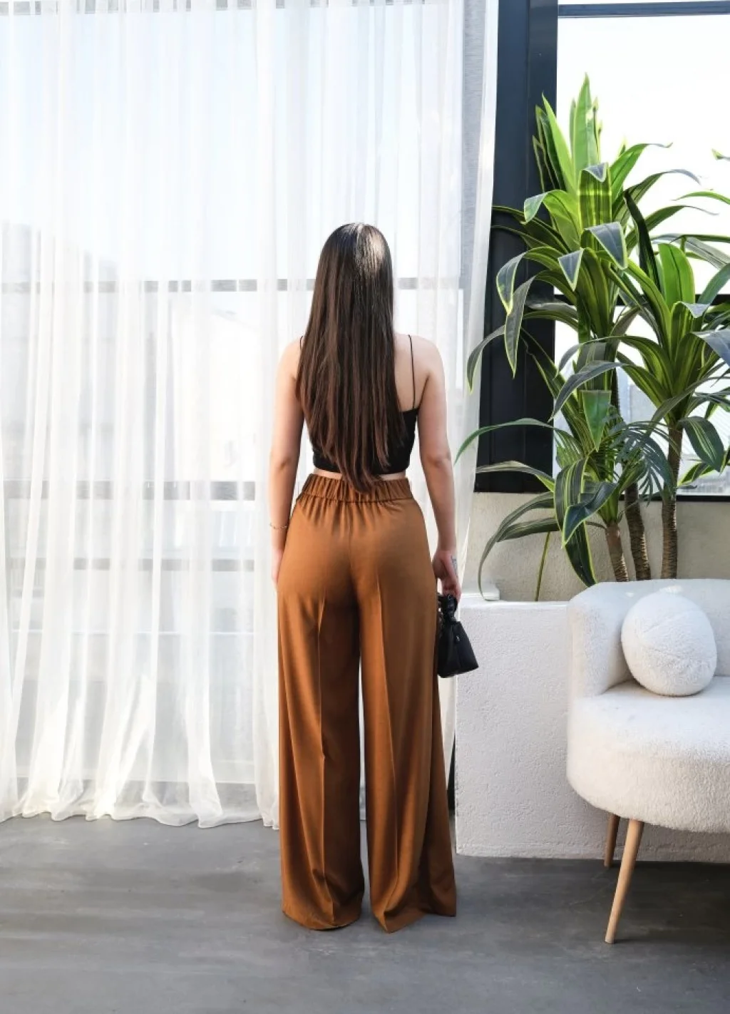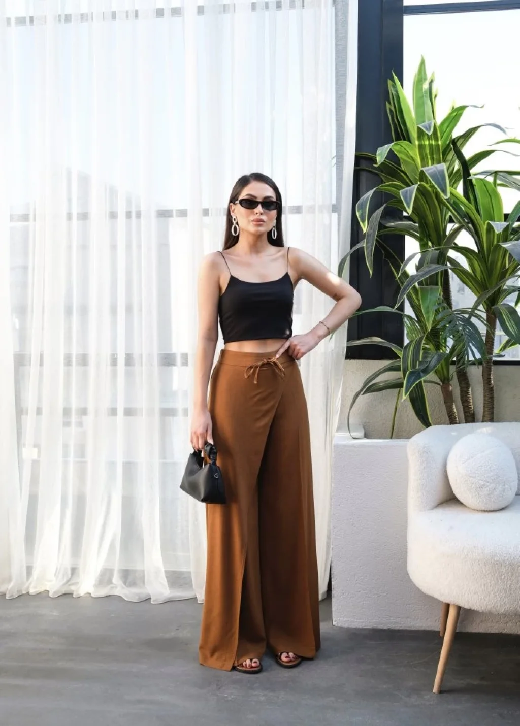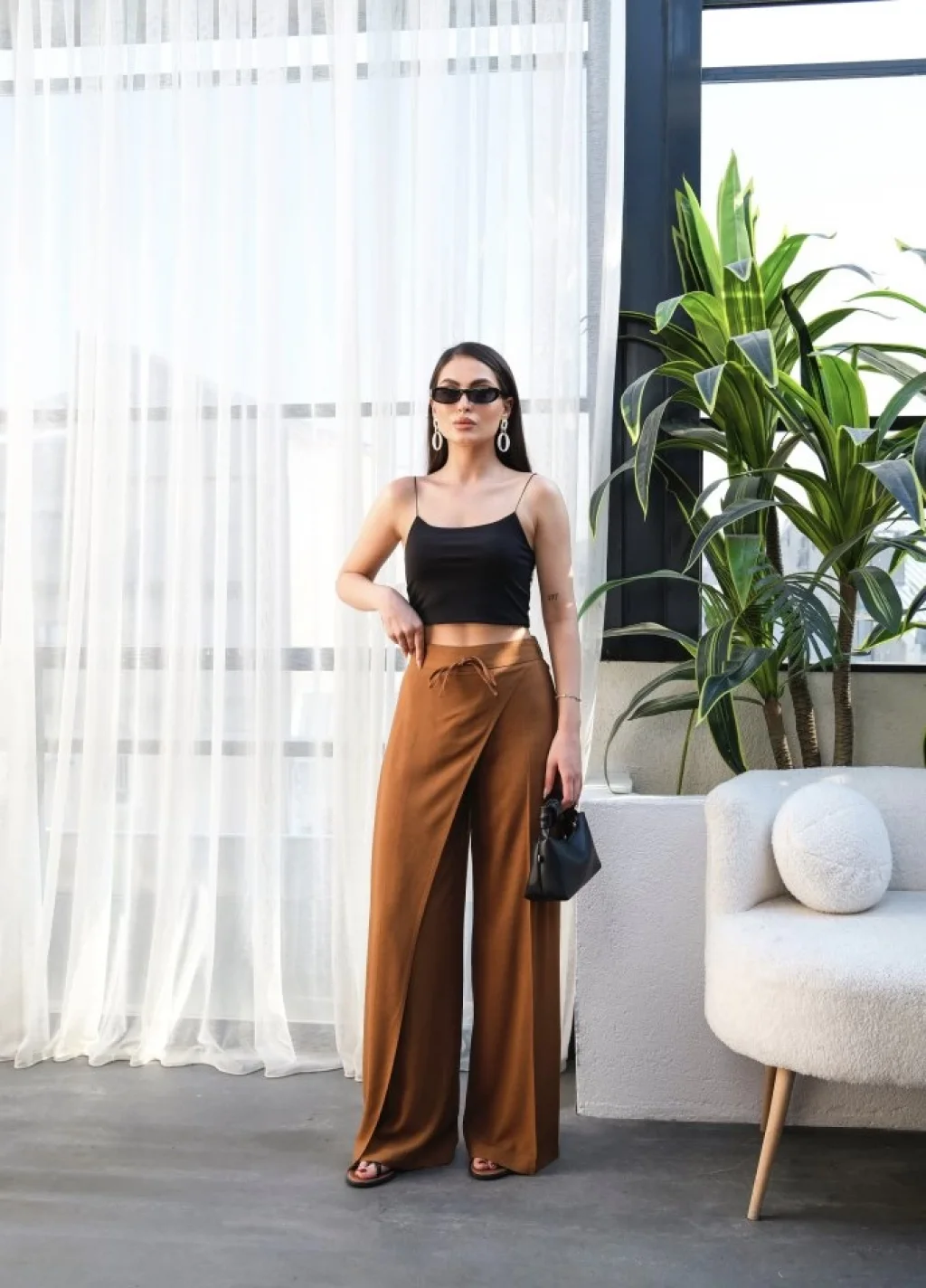 Keten Önü Çapraz Parçali Lasti̇kli̇ Ve Bağcikli Geni̇ş Paça Pantolon