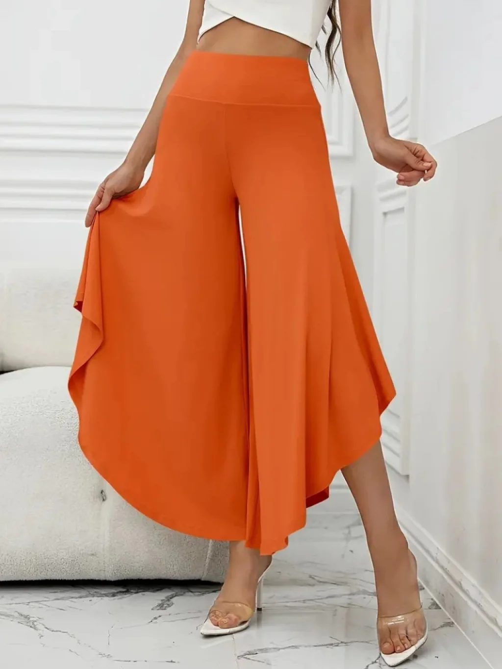 Kadın Yüksek Belli Geniş Paçalı Yanlardan Açık Sandy Pantolon