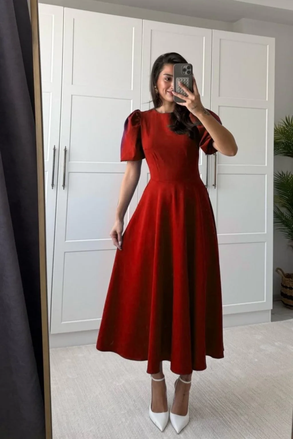 Kadın Kısa Balon Kollu Bisiklet Yaka Geniş Kesim Janjan Krep Elbise