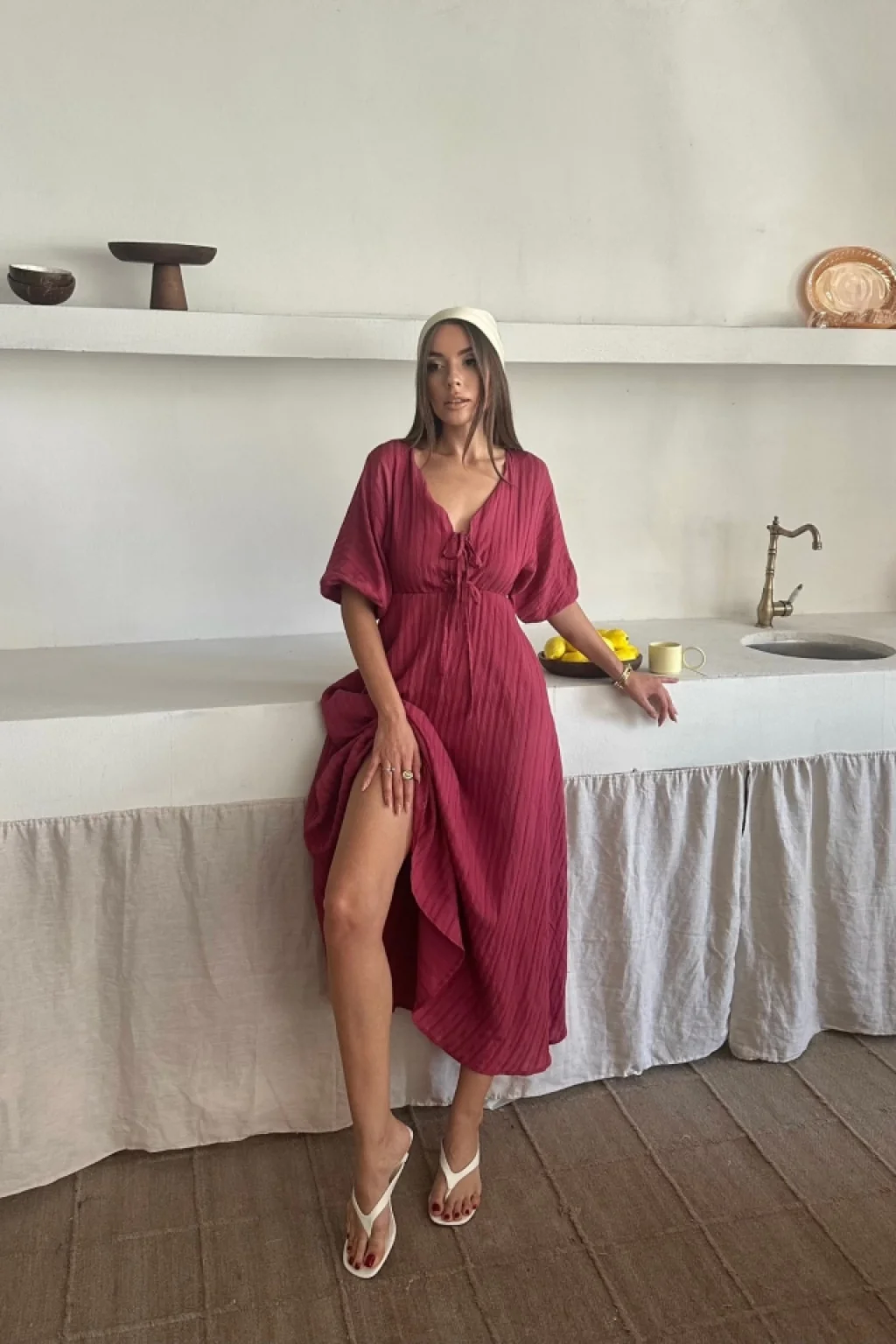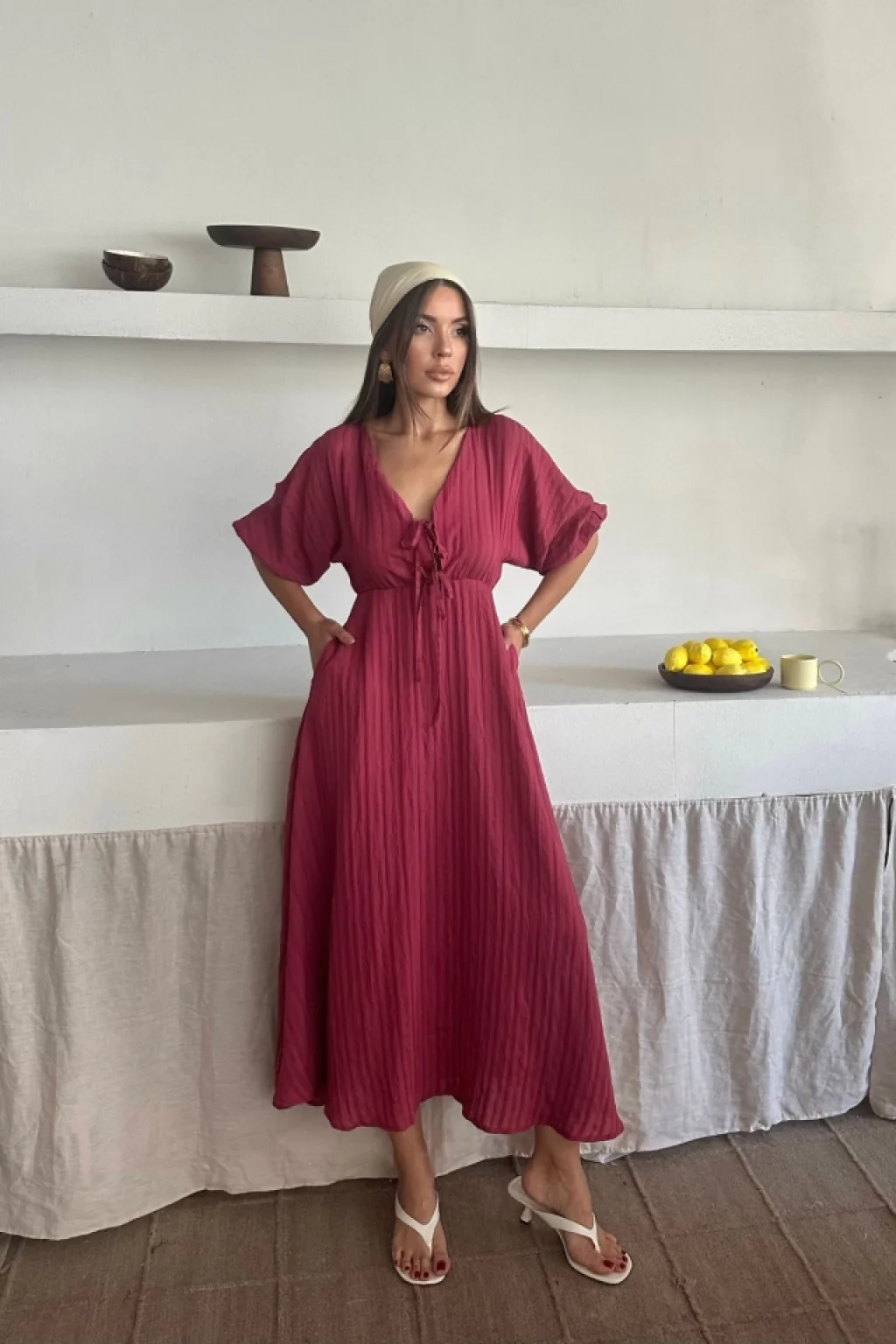 Kadın Kısa Kollu V Yakalı önden Düğmeli Bürümcük Midi Elbise