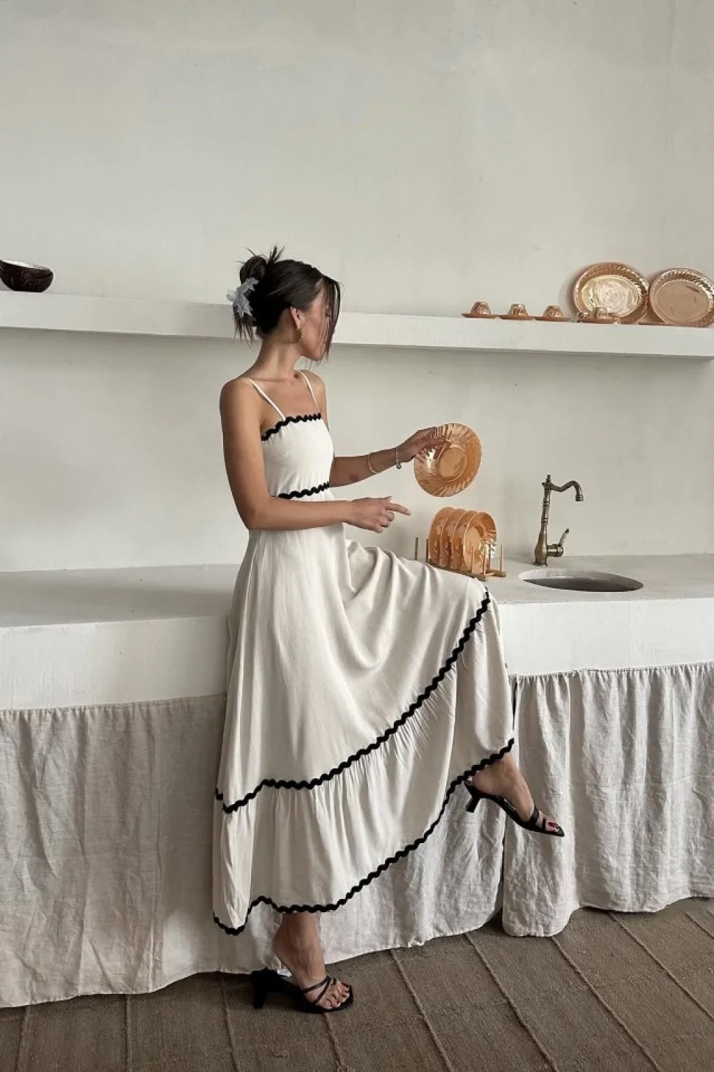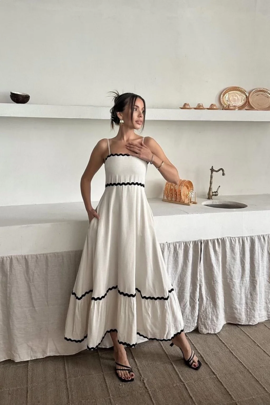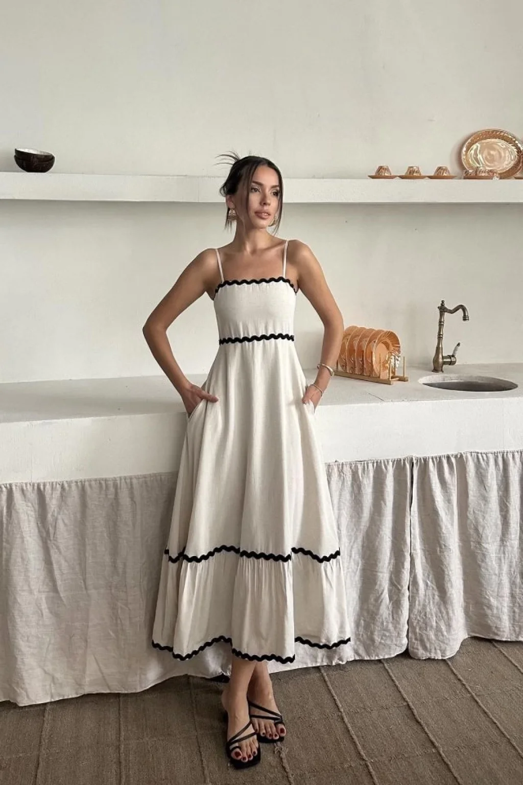 <p>Bej Şerit Detay Keten Elbise</p><br> <p>Modelin Ölçüleri: Boy:165, Kg:55, Göğüs:90, Bel:72, Kalça: 100</p><br> <p>Modelin üzerindeki ürün M/38 bedendir</p><br> <ul> </ul>