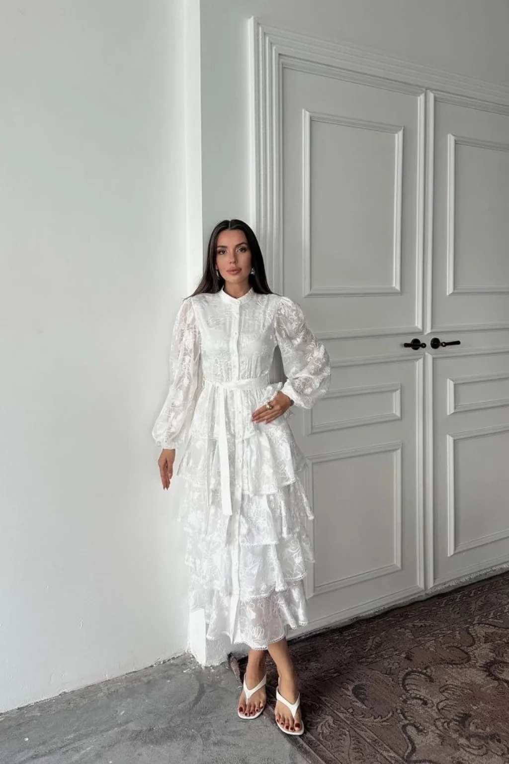 Beyaz Valonlu Şeritli Kat Kat Elbise