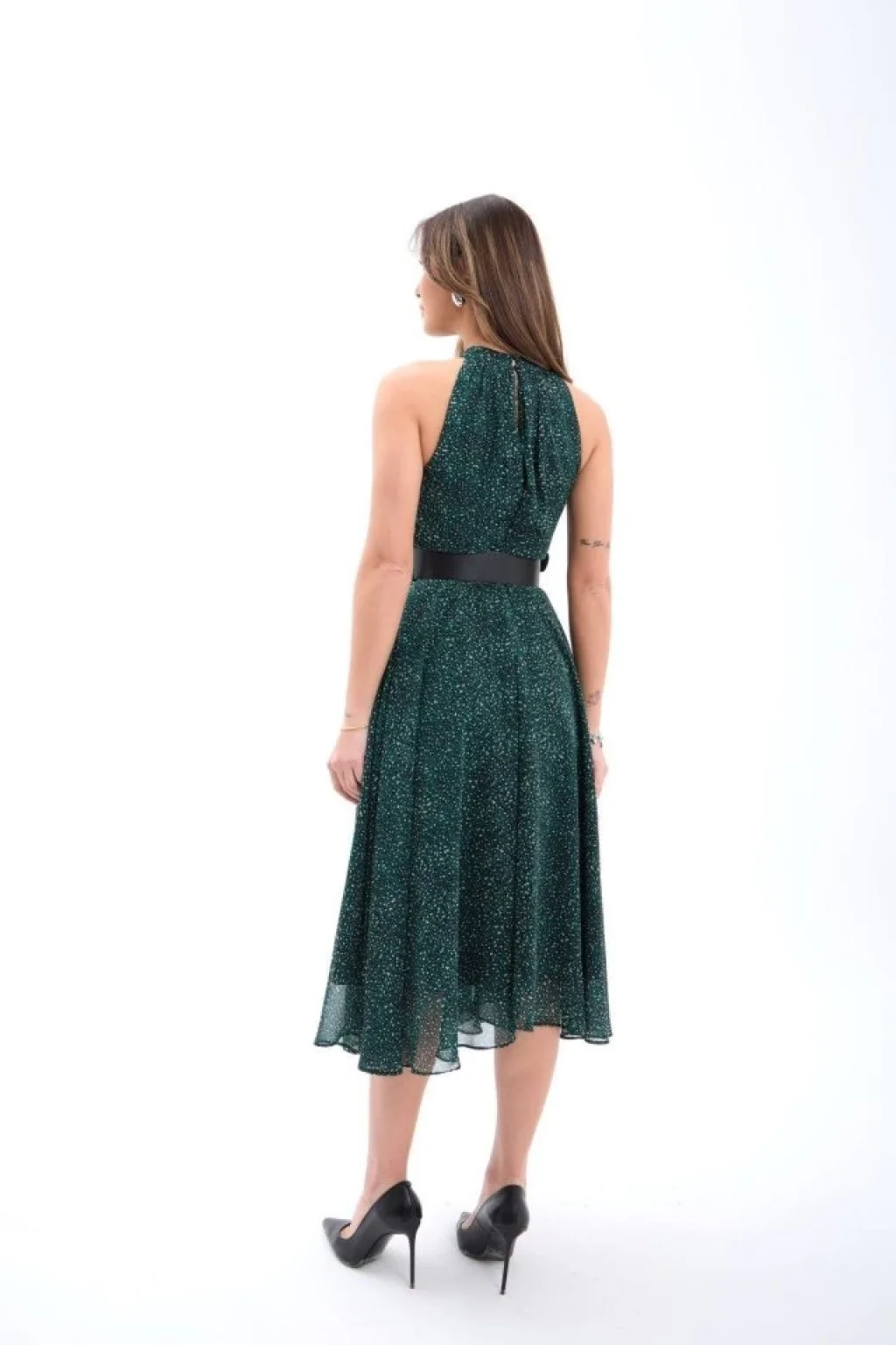 Kadın Uzun Kollu V Yakalı Kollar Puantiyeli Beli Kuşaklı Midi Krep Elbise