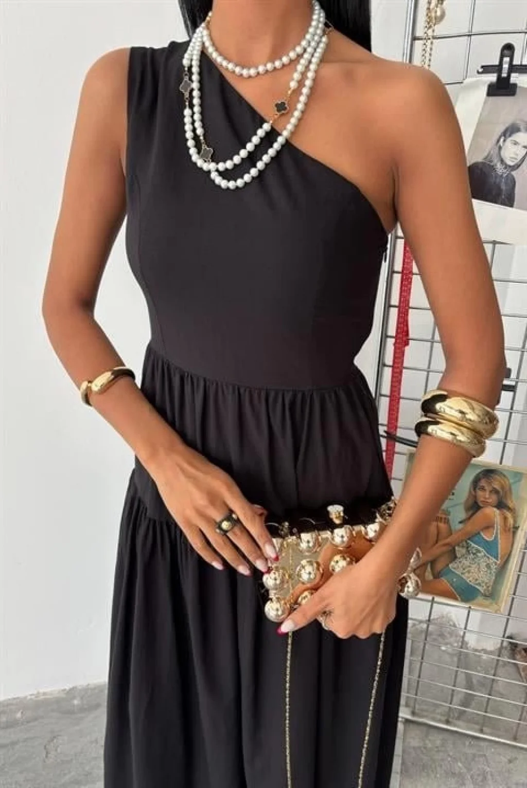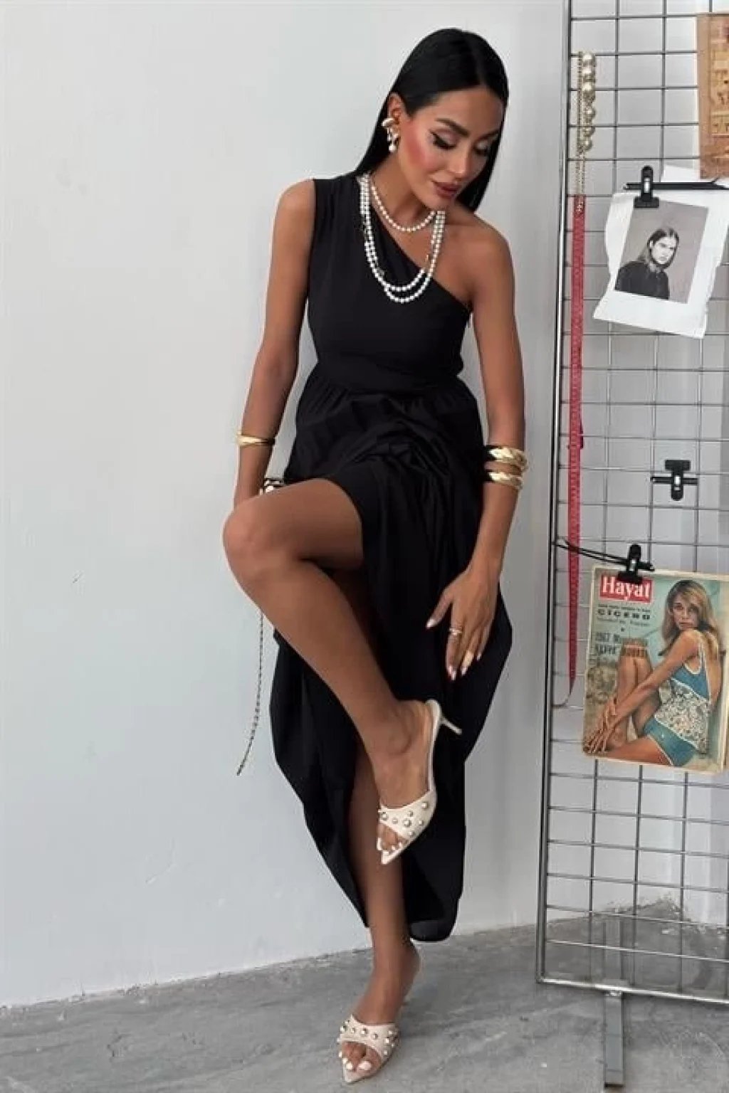 Tek Omuzlu Pile Detay Maxi Elbise 2895