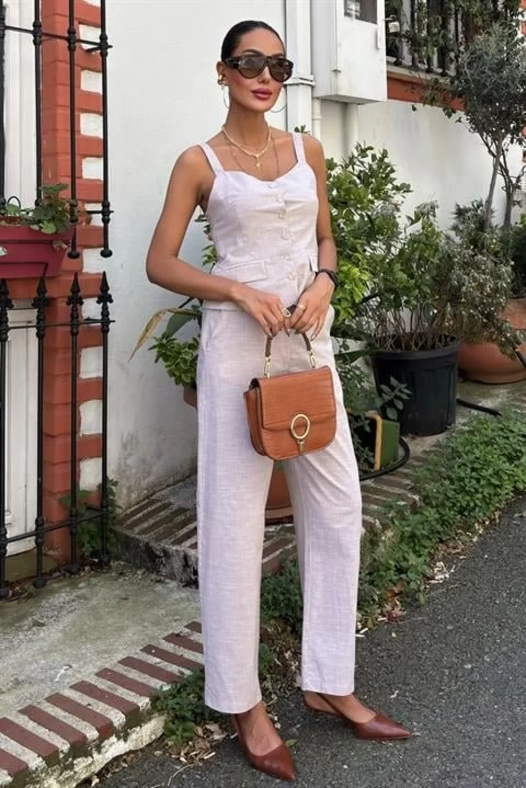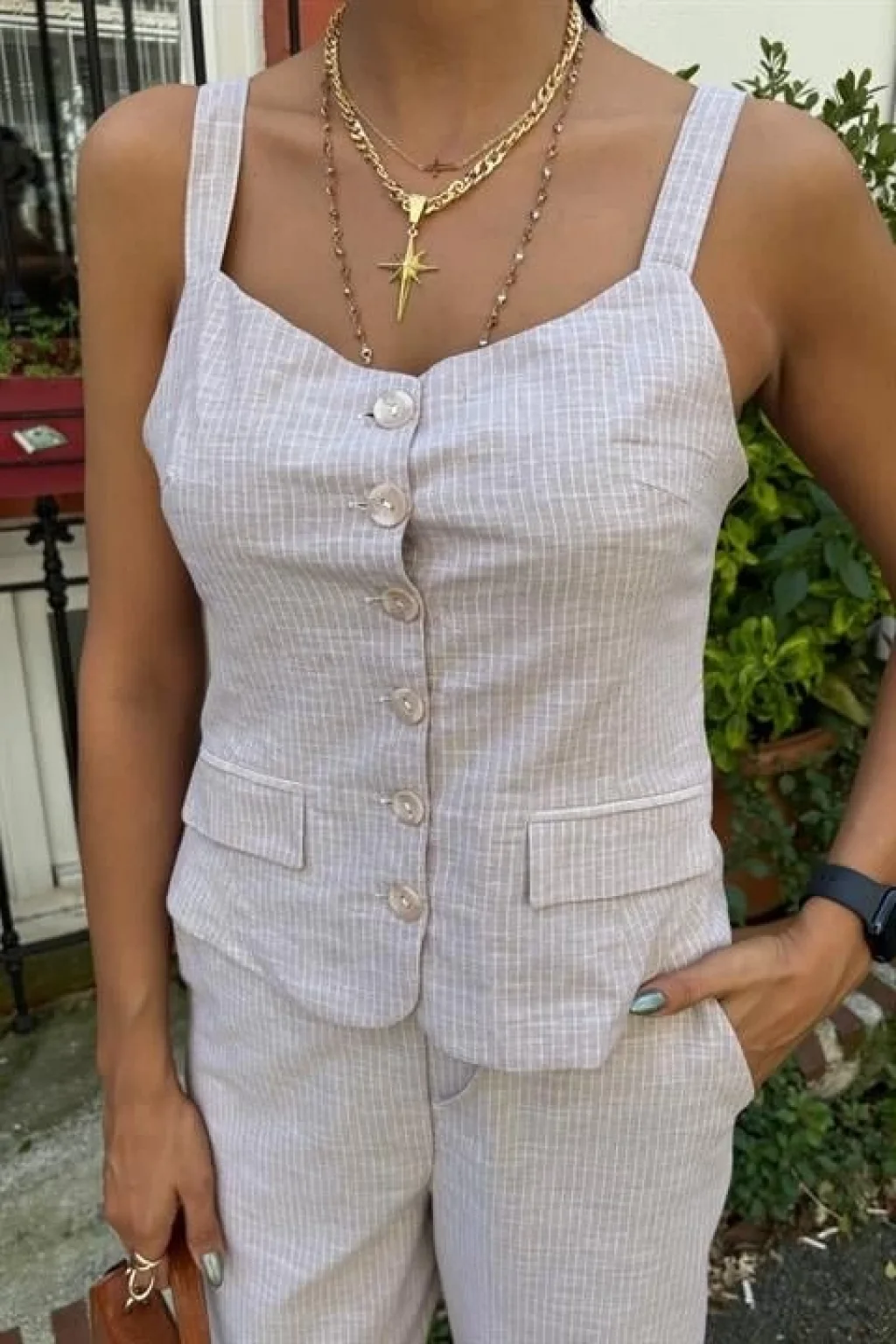 Kalın Askılı Bluz Pantolon Keten Takım 10187