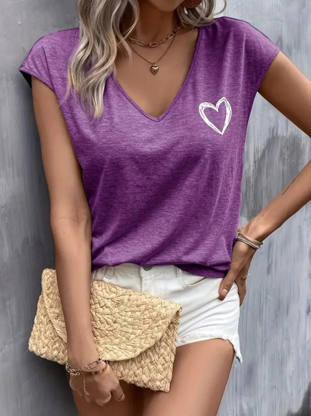 Kadın Kısa Kollu V Yakalı Kalp Baskılı Viskon Bluz