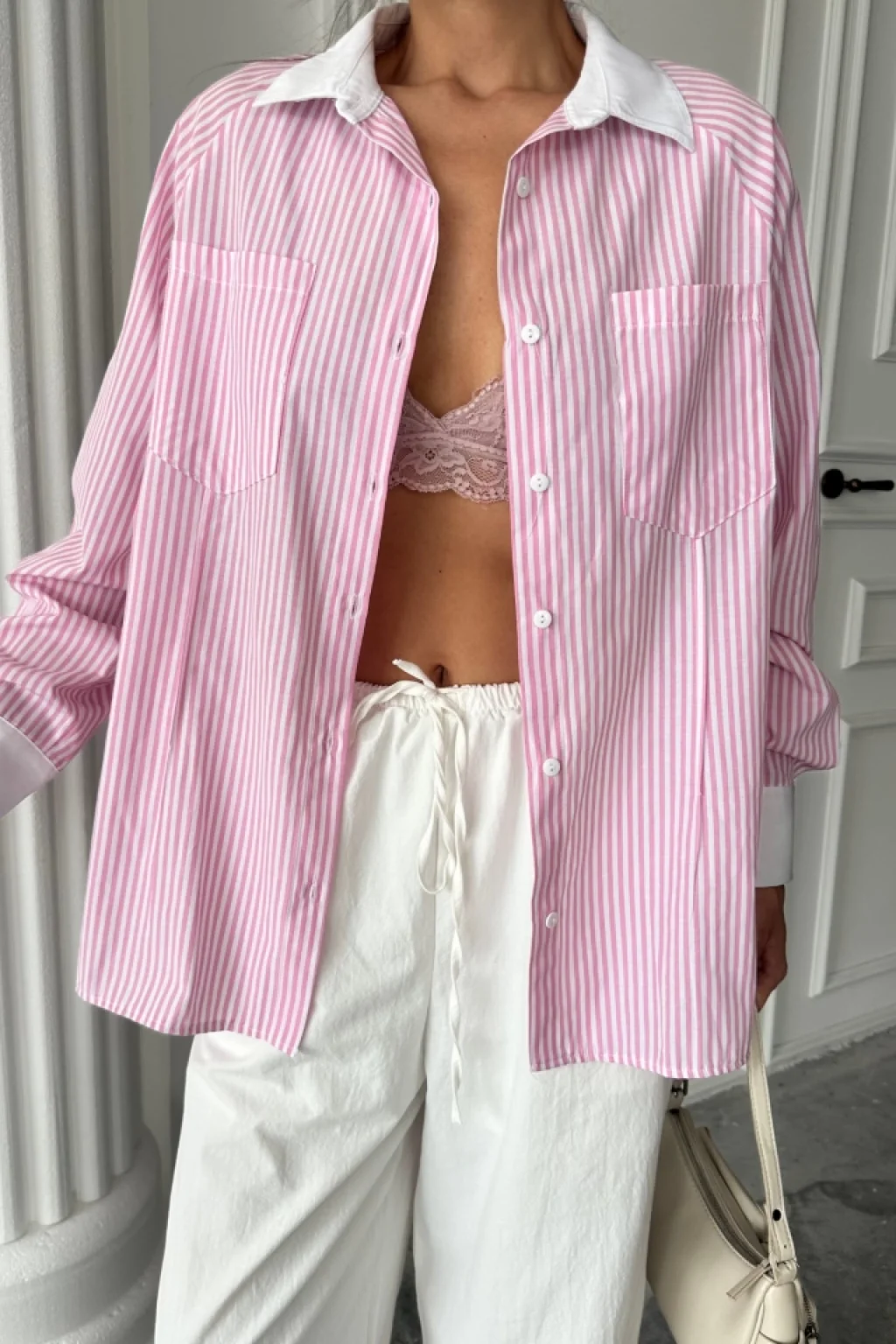 YAKA VE MANŞET BEYAZBOYFRİEND ÇİZGİLİPOPLİN GÖMLEK - Pembe