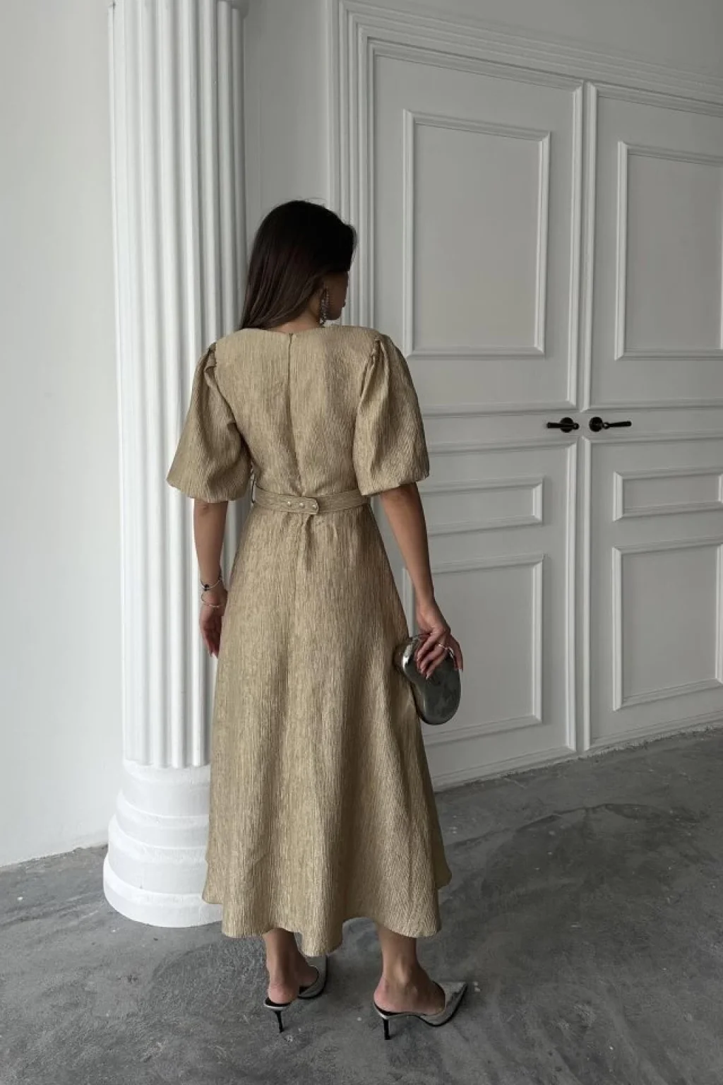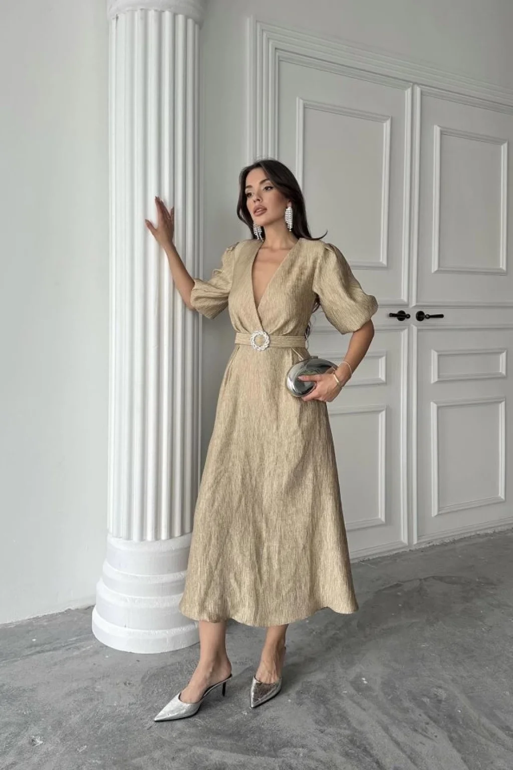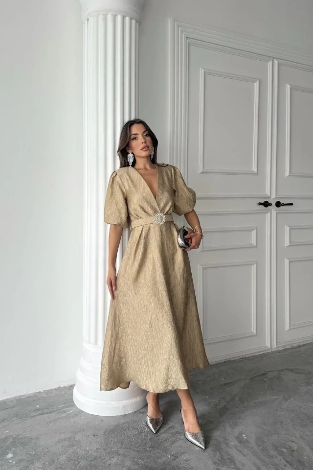 Gold Işıltılı Kemerli Kruvaze Elbise